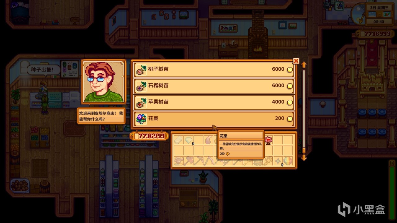 (3)与单身村民八心后可以来到皮埃尔杂货铺买花束送给满心村民,赠与后确认恋爱关心,提升好感上限到十心。