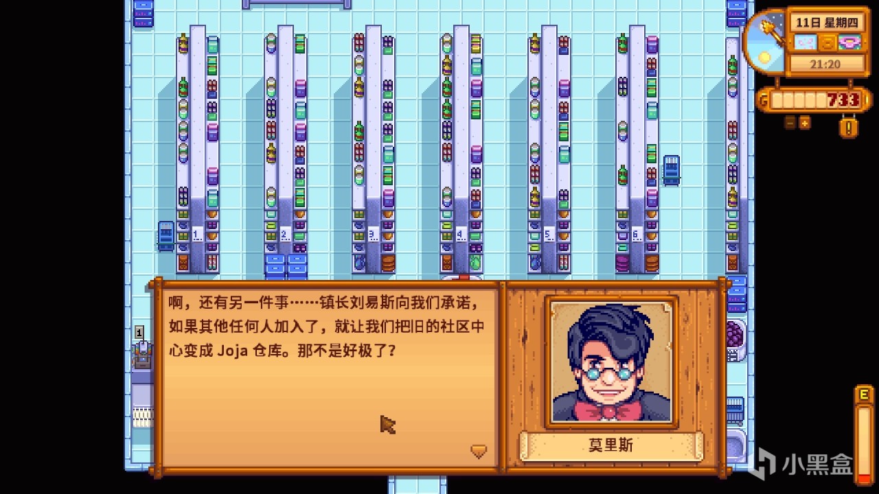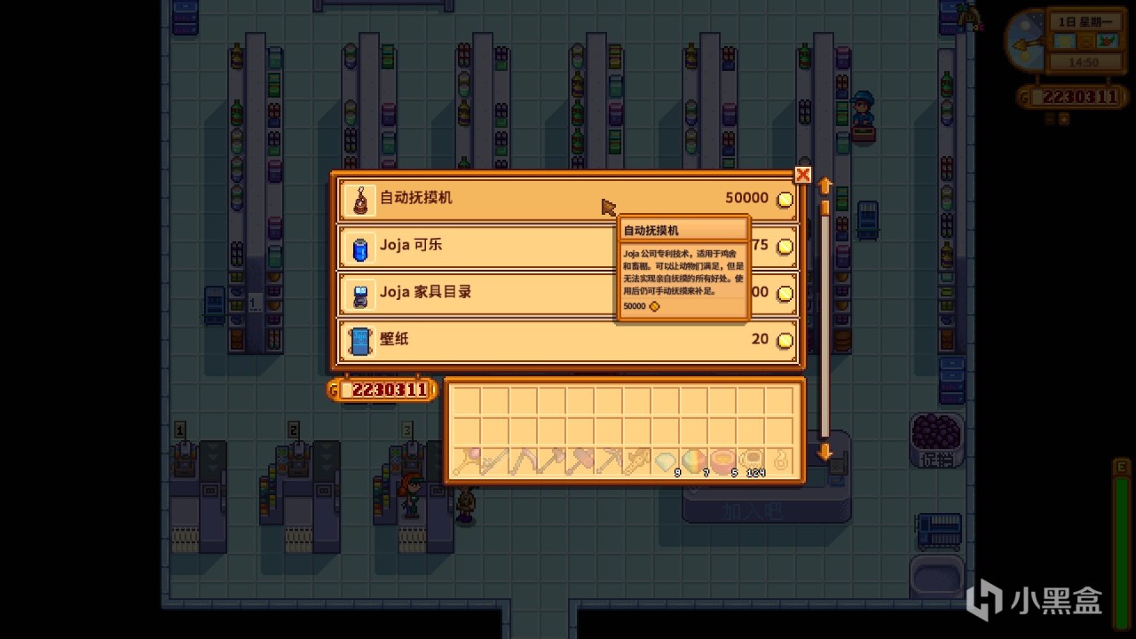 (2)如果在社区中心修复路线上,选择了joja方案将社区中心改造仓管,之后joja超市会出售自动抚摸机。