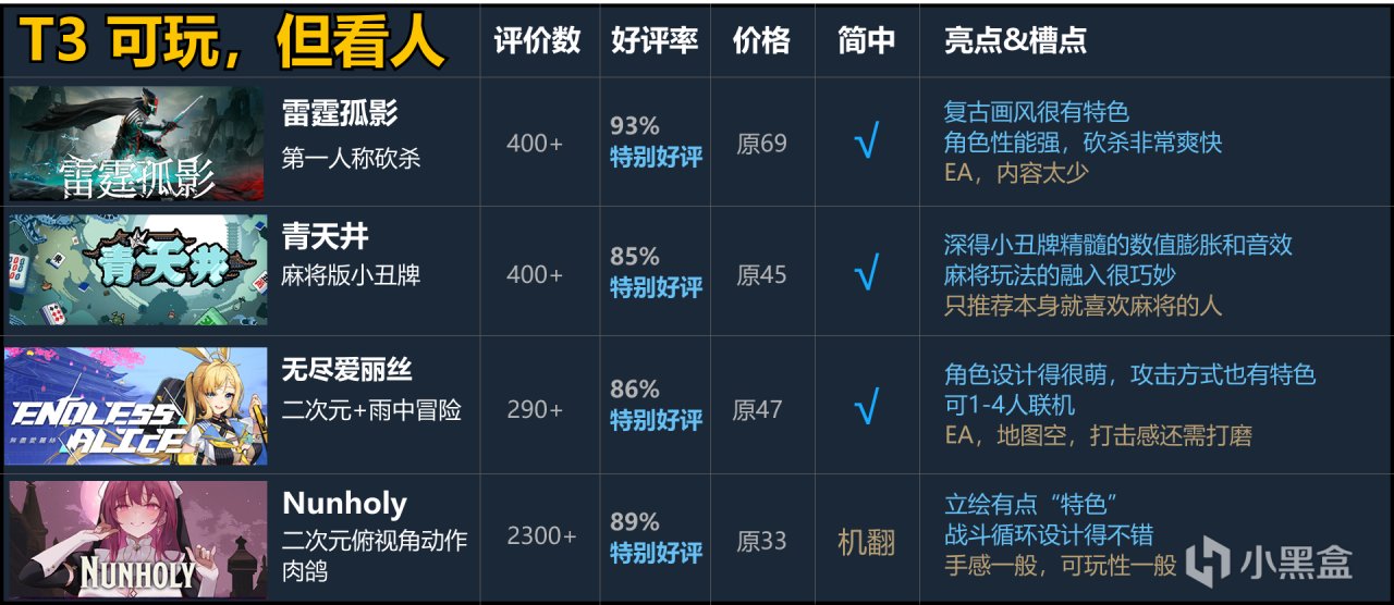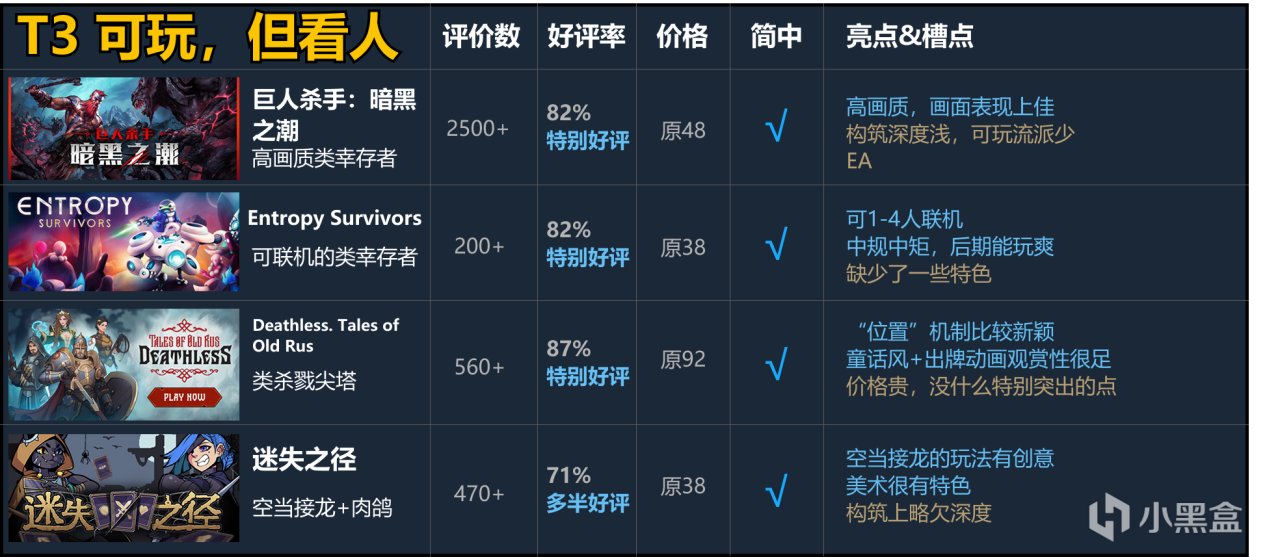 高畫質類倖存者,美術和畫面表現很能打,但整體上沒啥亮點,構築的內容比較淺,能玩爽的流派很固定。