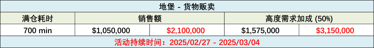 高度需求:战局中每存在一名非己方组织的玩家,完成地堡货物销售可获得额外 2.5% 奖励,上限为 50%,该奖励非整数时向上取整。