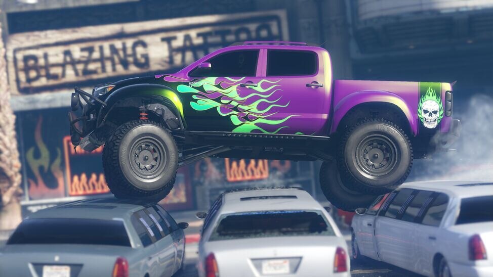超高悬挂和越野胎保证了良好通过性,超重车体压制速度也带来了稳定性,行驶惯性大但稍加利用也能很快速过弯,能轻松征服洛圣都的高山斜坡。
