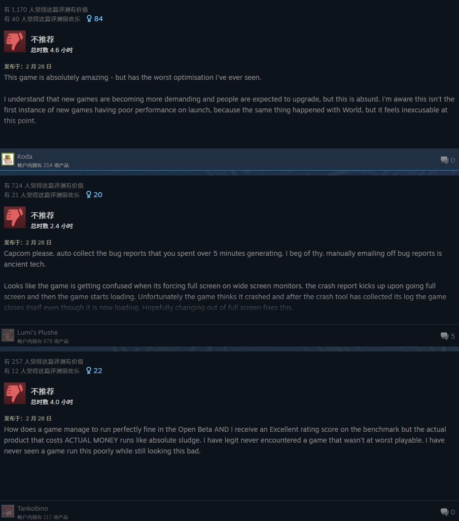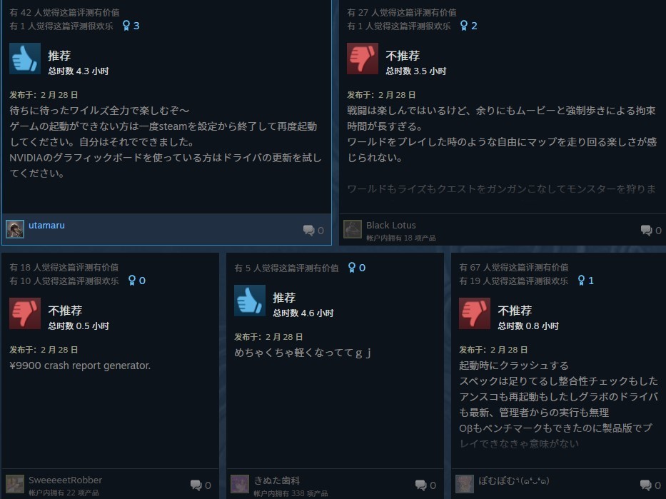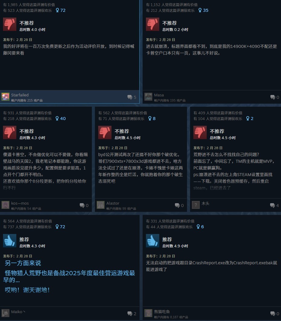 目前,《怪物獵人:荒野》在Steam的評價爲褒貶不一(好評爲45%)。