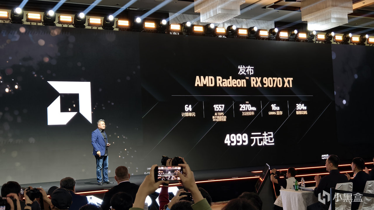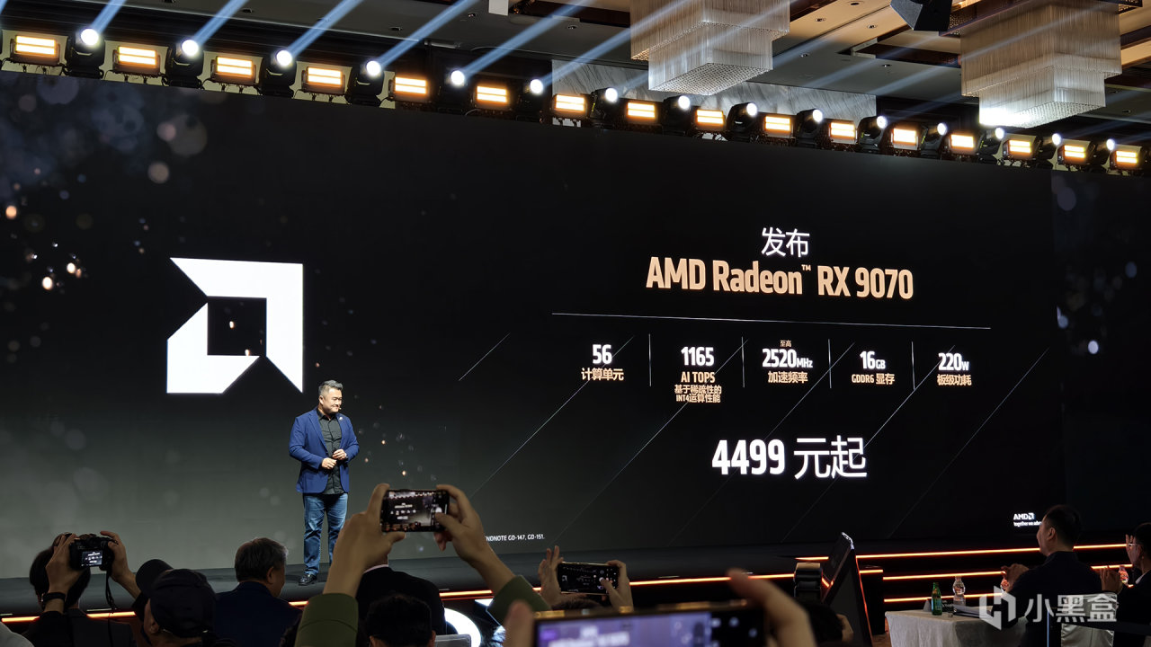 随着他的语调不断上升,他也终于按捺不住激动地说出了RX 9070的建议零售价——4499元起!!!这完全出乎意料,全场观众和嘉宾一下子炸锅掌声接连不断,RX 9070参数设计也是不错,达到至高2520MHz加速频率,配备16GB GDDR6显存,拥有56个计算单元提供1165 AI TOPS算力,而功耗只有220W。