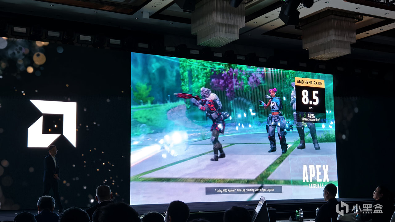 随后端上来的技术是HYPR-RX,它集成了RSR超分辨率、Radeon Anti-Lag+增强抗延迟以及Radeon Boost加速三大功能,演示的游戏是APEX英雄,可见延迟只有8.5 MS,相比开启前降低了42%,效果显著。
