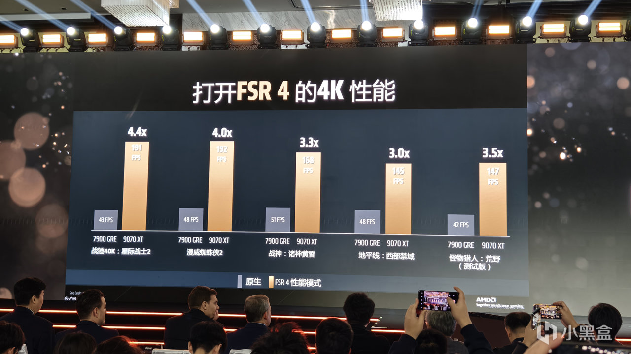 接着演示的是RX 9070 XT打开FSR 4技术后的4K性能,提升幅度相当不错达到3~4倍左右,其中已经上市的怪物猎人:荒野这款热门游戏,借助FSR 4可达到147fps。