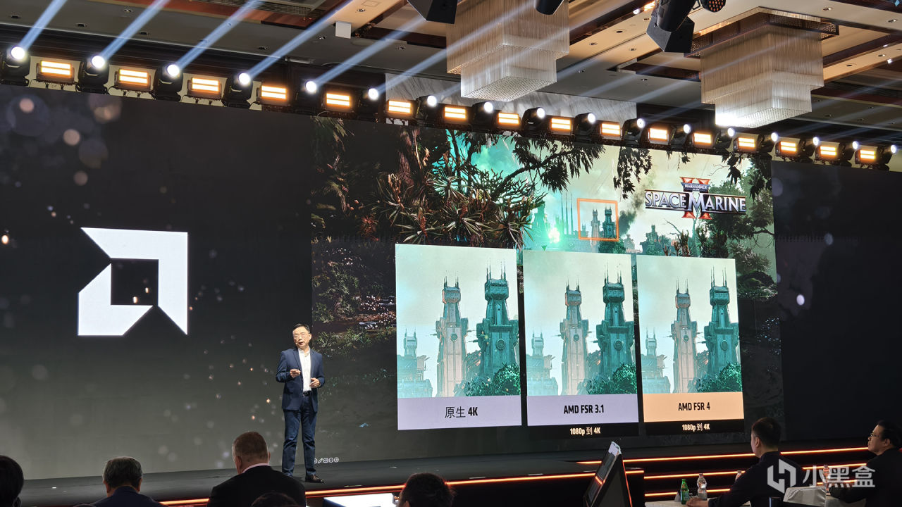 随后王启尚现场展示了FSR 4的画质效果,对比游戏是战锤40K:星际战士2,截取画面中的远处建筑物,可见原生4K抗锯齿也不完美,建筑物顶端天线渲染出来的线条是断截的,而FSR 3.1会好一些起码轮廓是能呈现,而FSR 4就是完美解决方案,能清楚看到天线的轮廓以及完整线条~