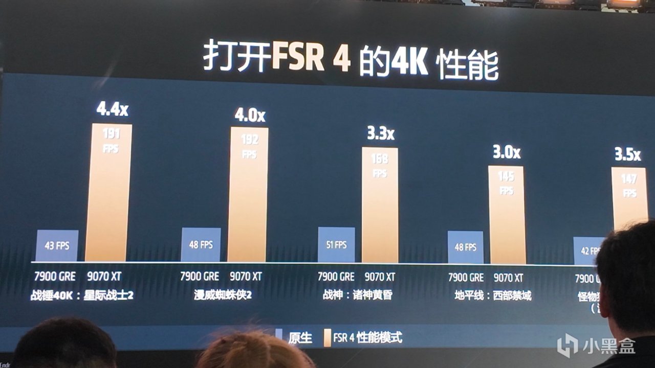 官方以9070 XT显卡为例,展示了5款游戏在原生画质和FSR 4性能选项下的表现对比,游戏平均帧数至少提升3倍,至多提升4.4倍。(不过,PPT上是用9070 XT和7900 GRE进行的对比)