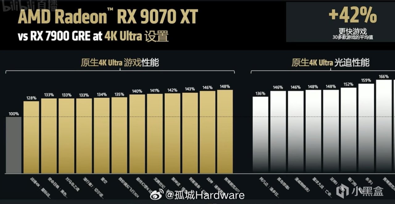 AMD Radeon RX 9070 XT显卡在4K Ultra画质设置的主流游戏中,相比RX 7900 GRE平均性能提升了 42%;其中光栅游戏性能最高提升48%,光追游戏性能最高提升66%;