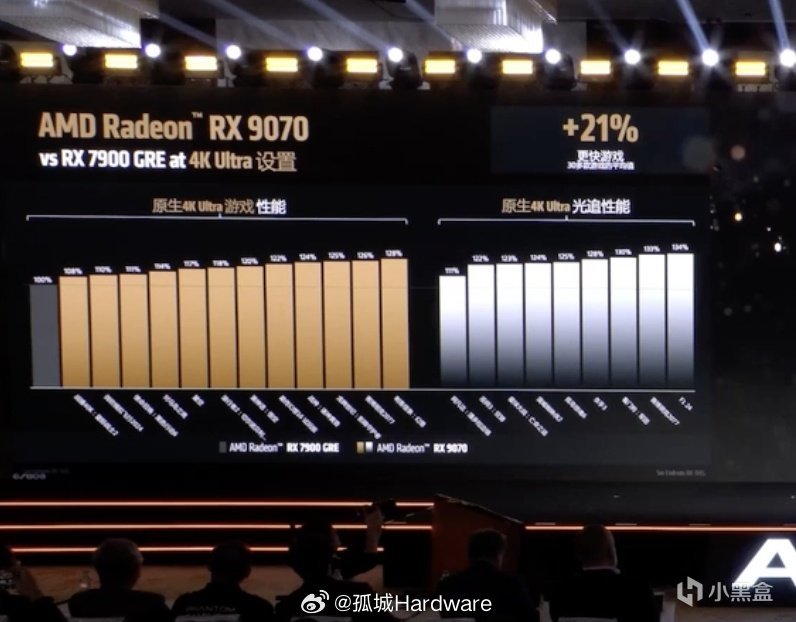 AMD Radeon RX 9070显卡在4K Ultra画质设置的主流游戏中,相比RX 7900 GRE平均性能提升了 21%;其中光栅游戏性能最高提升28%,光追游戏性能最高提升34%;