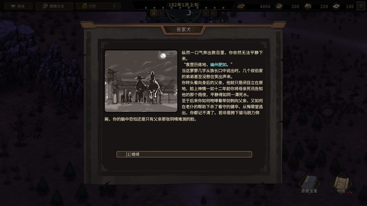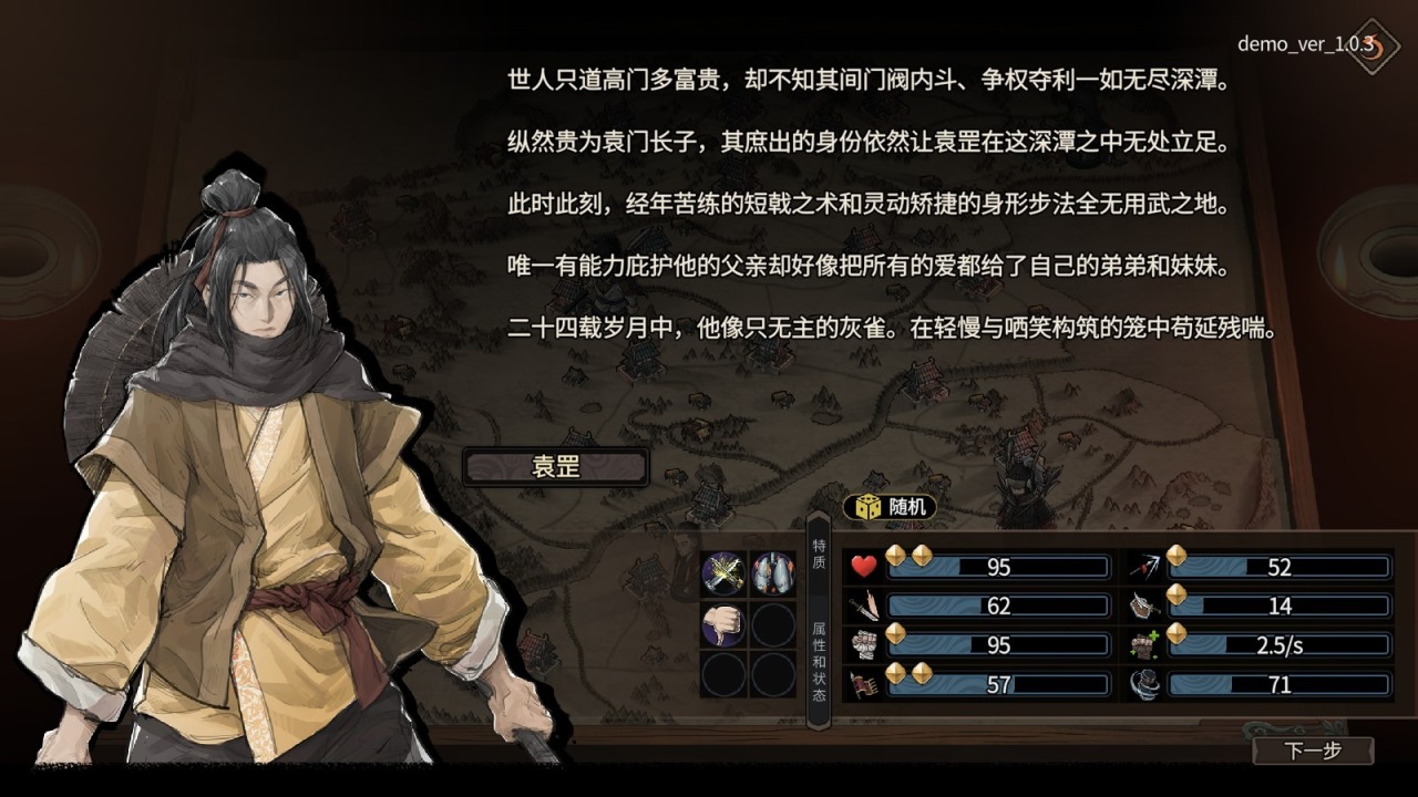 在《猛将三国》DEMO里,我们扮演的主角袁天罡,哦不,袁罡,是一个因为身份是庶出而被袁氏集团以“外出历练”之名逐出家族的少年。不过好在我们有一位老仆辅佐,以及两个家臣充当武将。为了在乱世立足,主角一行人只能去找远房伯父袁绍求收留。