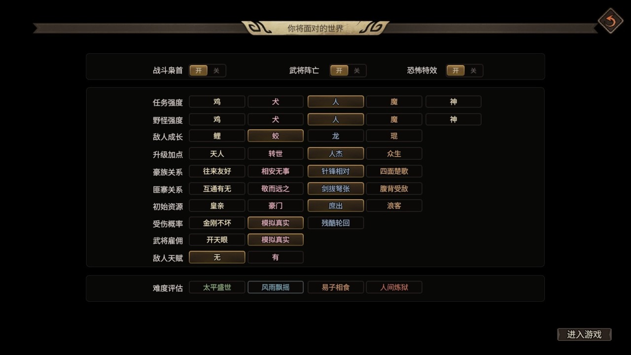 仅仅是设置主角的属性还不够自由,这个游戏在开局之前能自定义游戏世界各项属性的等级,从宏观到微观、从势力关系到主角体质,各项指标基本上涉及到游戏体验的都能自定义,是难是易都完全可以自己决定,这自由度没话说了吧?简直就是整个世道由玩家来定义了——你若不想在东汉末年吃太多苦,就直接全低难度选上,享受最低难度【太平盛世】吧。