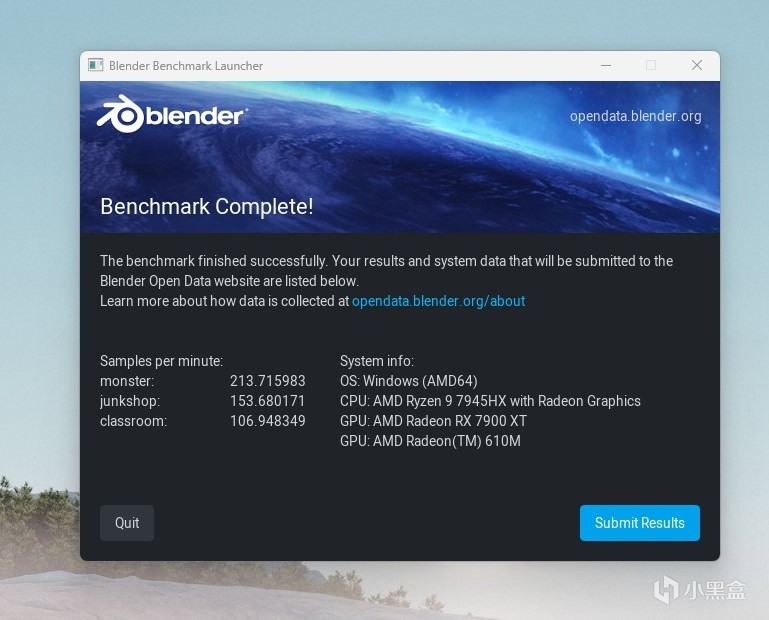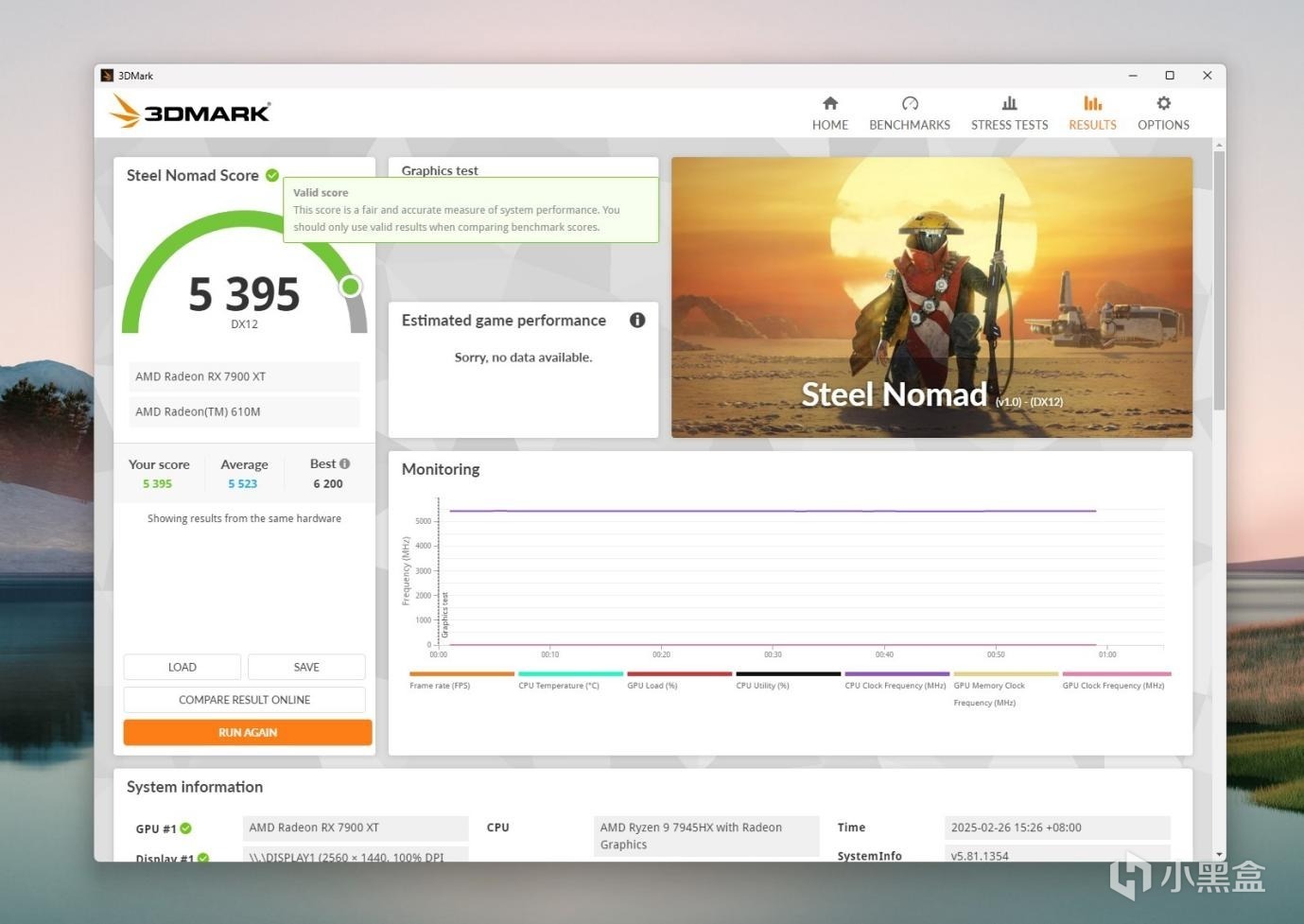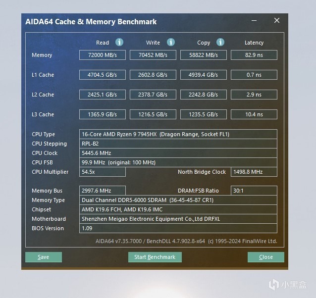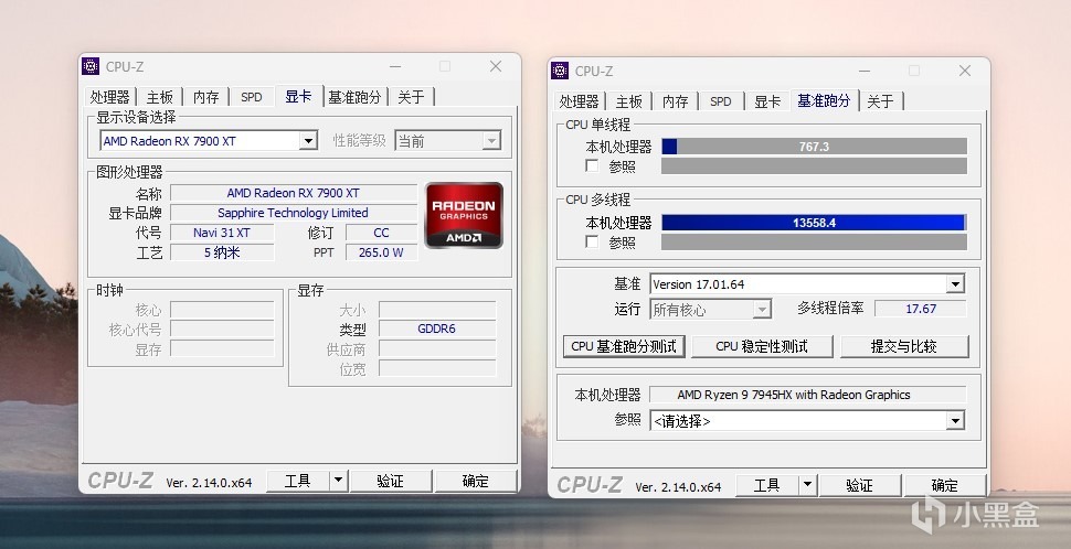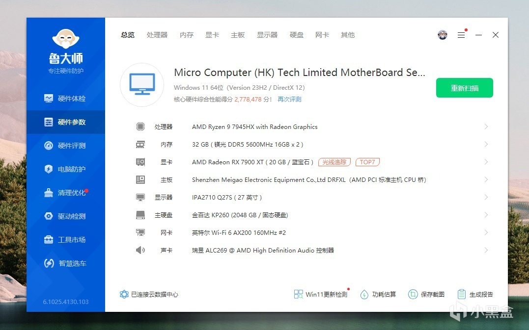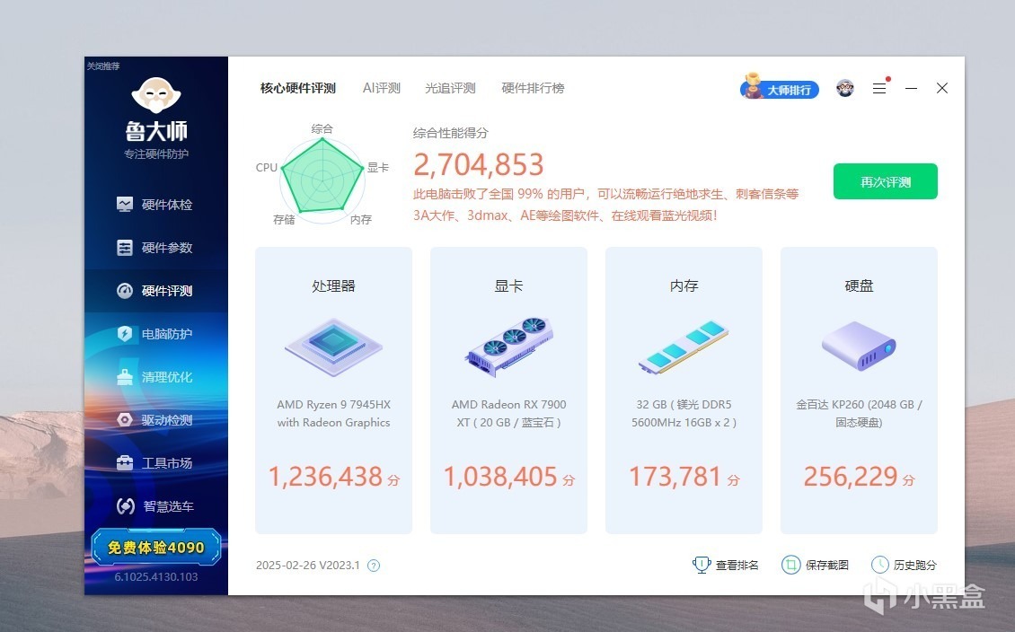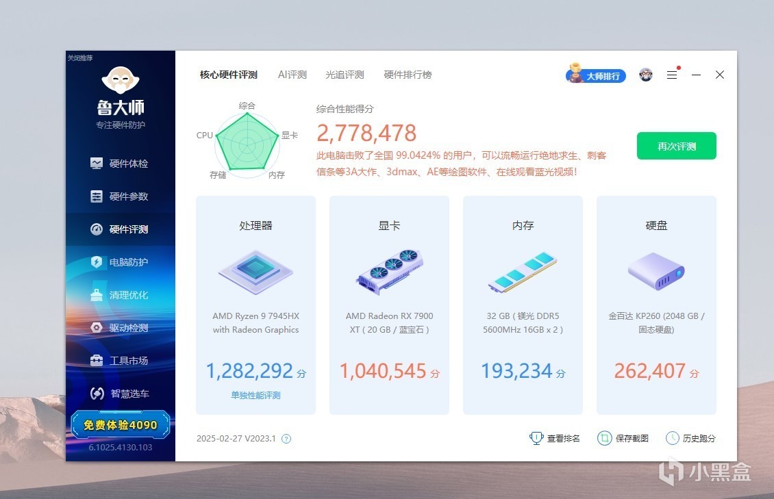 運行魯大師看看識別的電腦配置,CPU是AMD R9 7945HX,鎂光DDR5 5600MHz內存,說明這款英睿達的內存用的鎂光顆粒,藍寶石RX 7900XT顯卡 20GB。