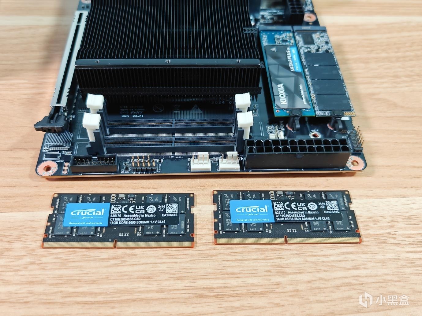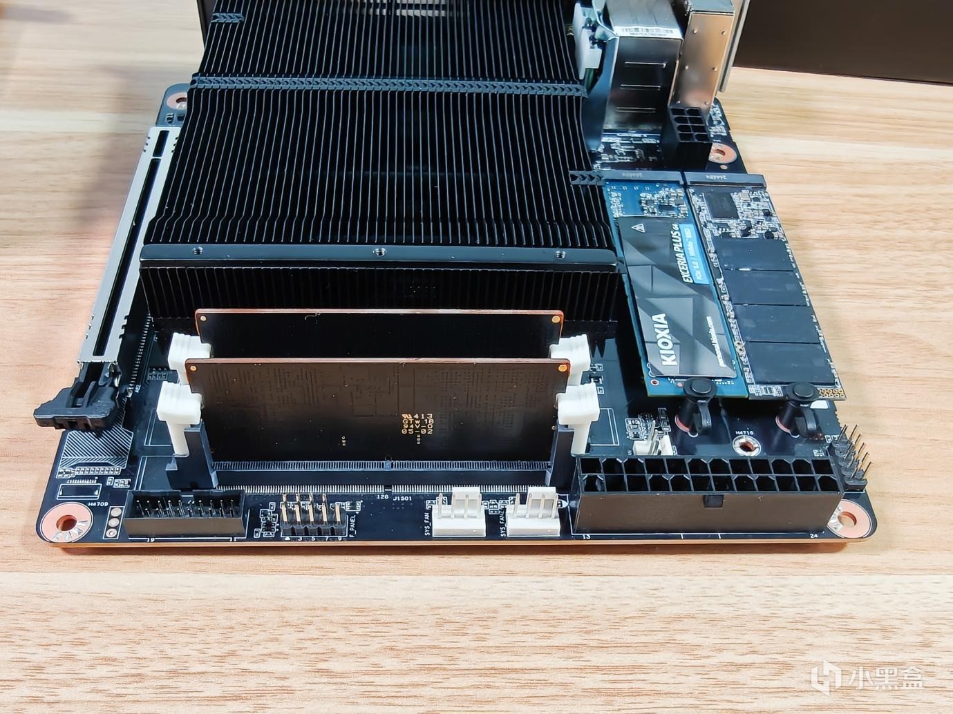 首先看這一側,有24PIN主板供電接口,3個白色風扇接口,機箱面板接口,USB 3.2 Gen1 機箱前置USB接口。2個SO DIMM內存插槽,就是俗稱的筆記本內存插槽,支持DDR5內存,最大總容量一共96GB,頻率5200MHz。不過實測還可超頻超過這個頻率。
