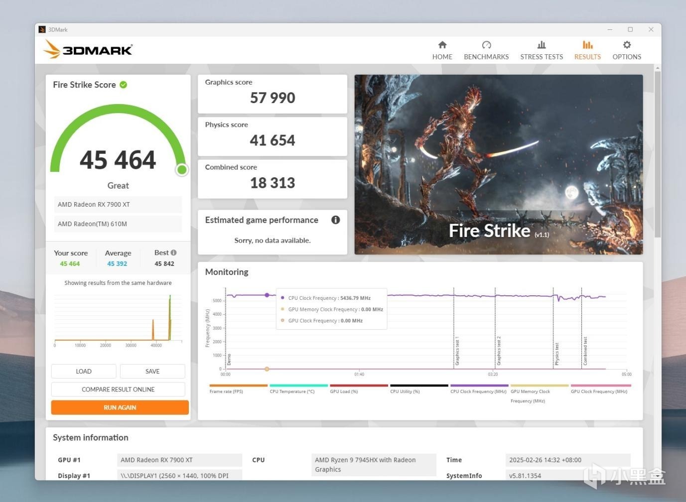 3DMARK Fire Strike,總分45464,其中物理分數41654,圖形分數57990,綜合分數18313。