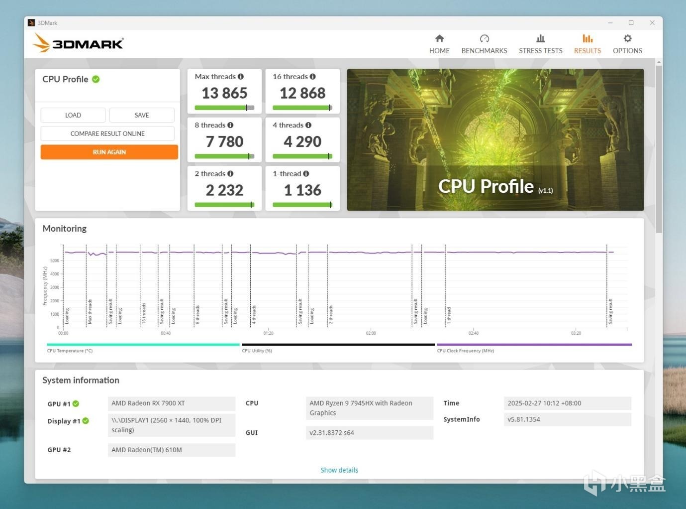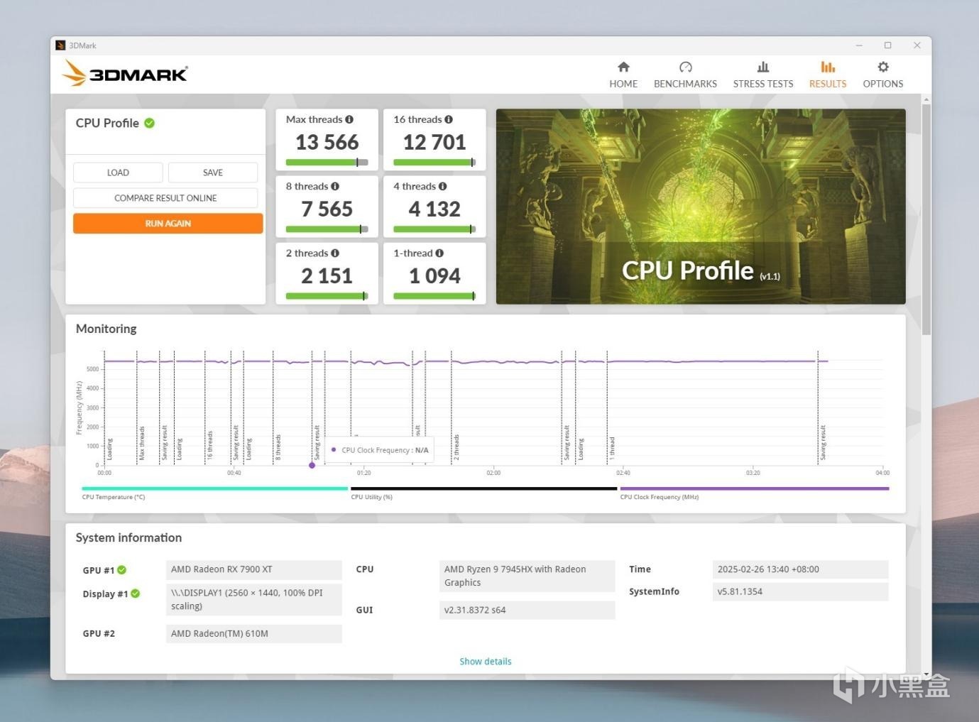 3DMARK CPU Profile測試,單線程1094,16線程12701,最大13566。
