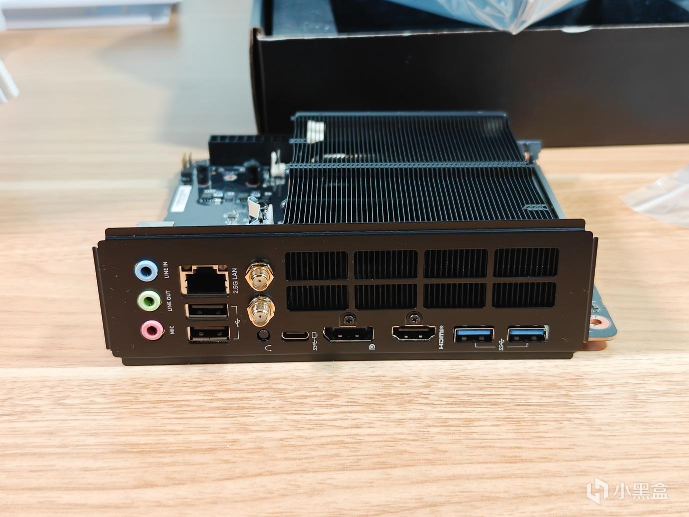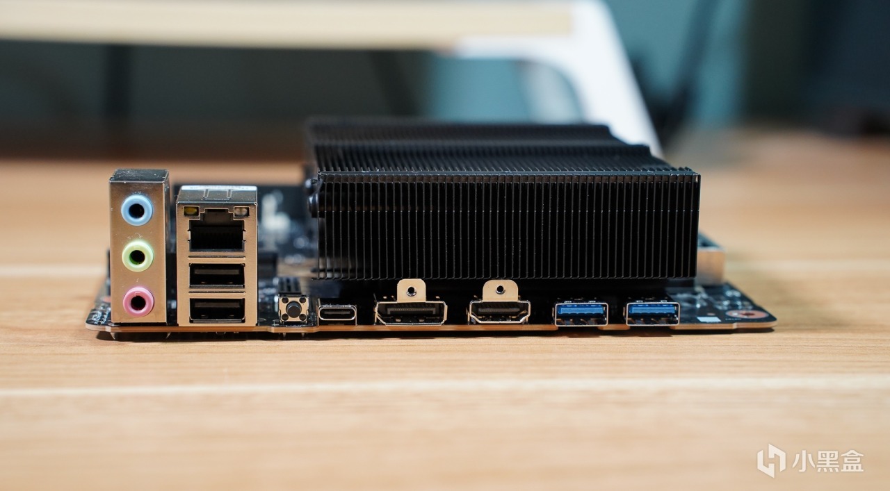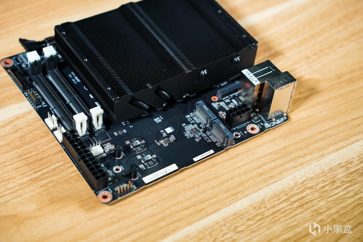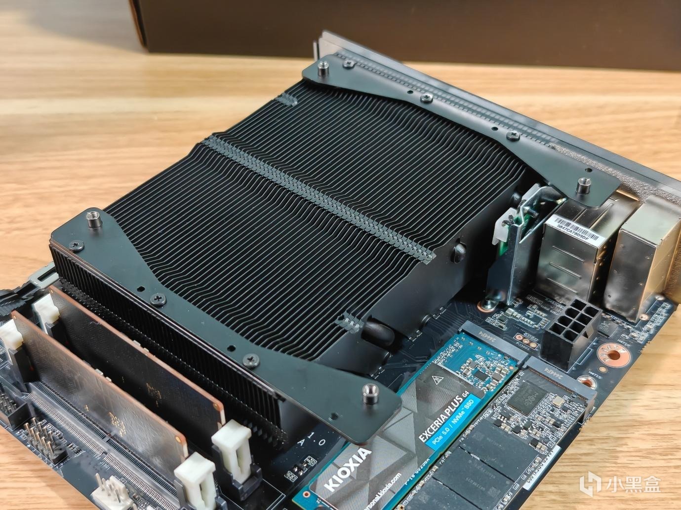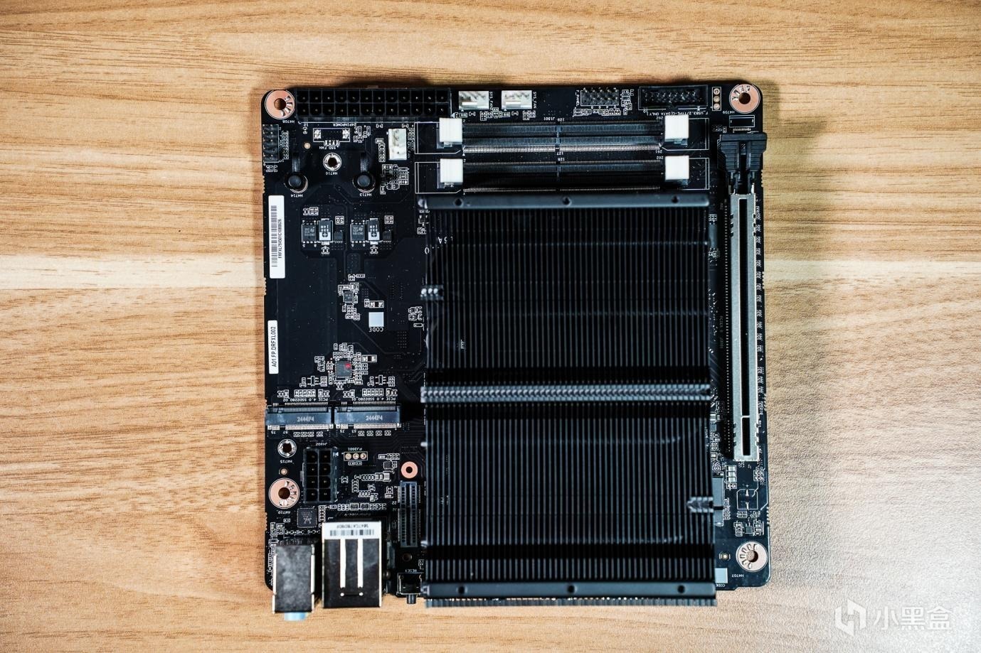 這款主板是標準的ITX板型,散熱鰭片佔據了絕大部分的空間,其餘的部件則分佈在四周。