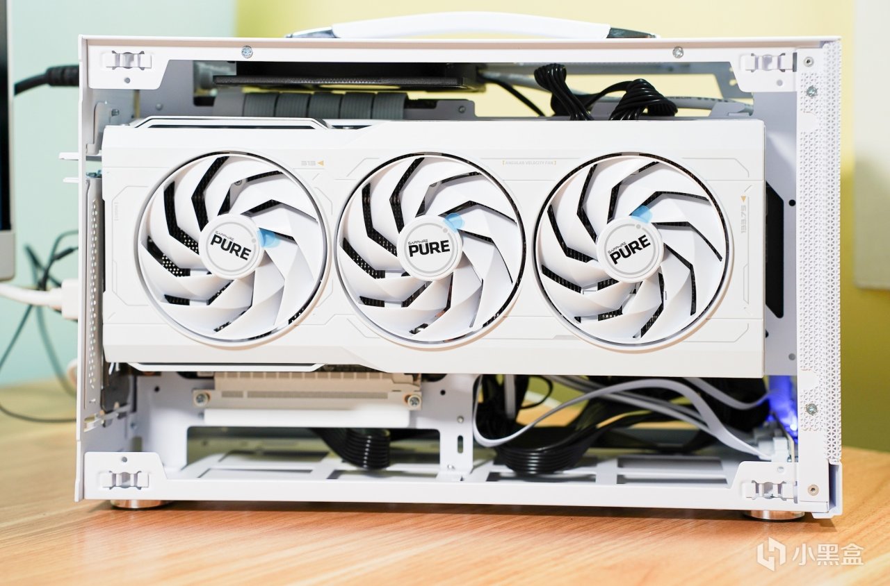 轉到另外一面,安裝顯卡。這款機箱支持340mm長顯卡,所以我的3風扇顯卡終於用上了。顯卡是藍寶石的RX 7900XT極地版,20GB大顯存,現在流行本地部署DeepSeek,大家知道大顯存的好處了。轉接線的另外一端固定到中間的,有預設的螺孔。