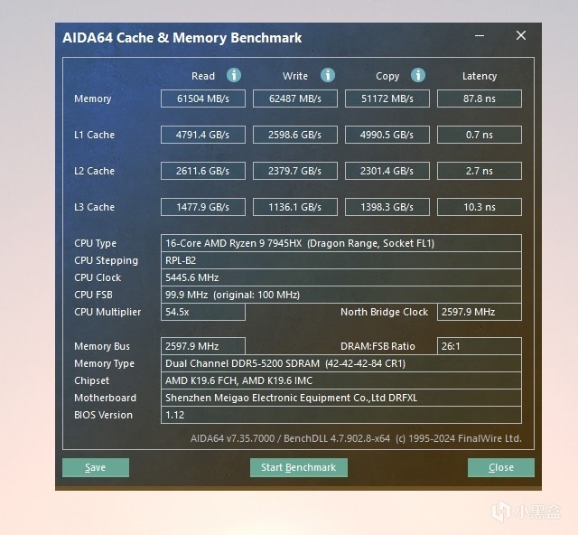 AIDA64 內存測試,讀取61504MB/s,寫入62487MB/s,複製51172MB/s,延遲87.8ns。
