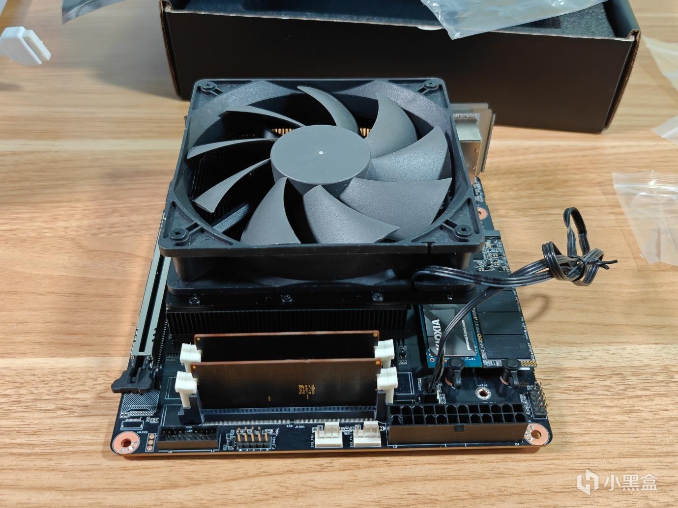 取出主板,首先引入眼簾的是碩大的散熱器鰭片。這款主板不僅預先裝好了CPU,更是連散熱片都放好了,並且支持安裝風扇。