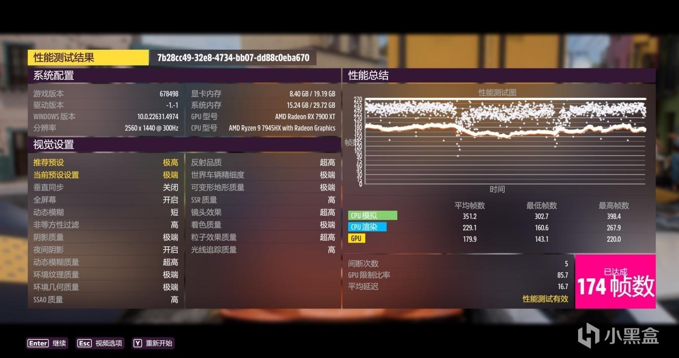 首先是地平線5的表現,2K分辨率,在極端最高畫質下,可達成174幀。其中CPU模擬平均351.2,CU渲染229.1。