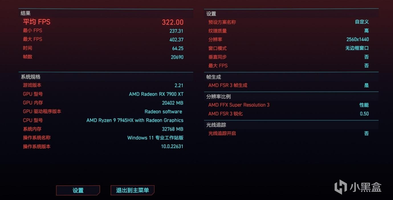 賽博朋克2077,2K分辨率,開啓AMD FSR3,超級畫質,幀速322幀。