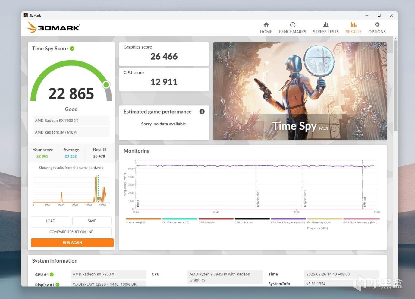 3DMARK Time Spy,總分22865,其中CPU分數12911,圖形分數26466。