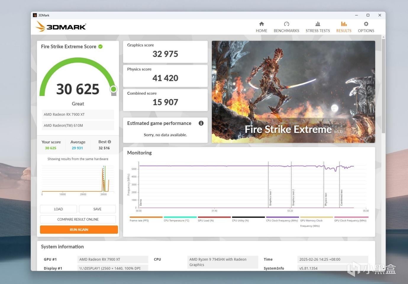 3DMARK Fire Strike Extreme,總分30625,其中物理分數41420,圖形分數32975,綜合分數15907。