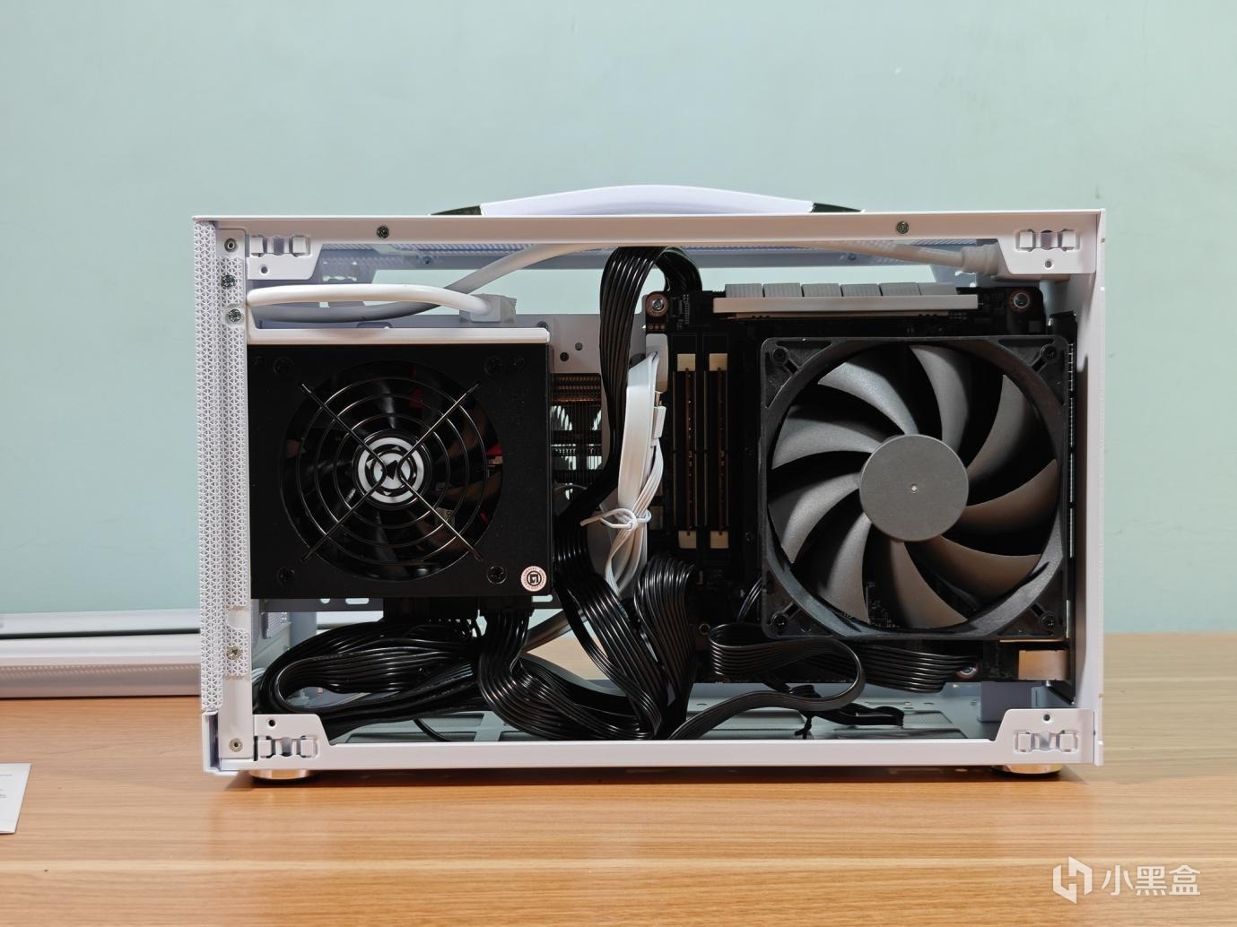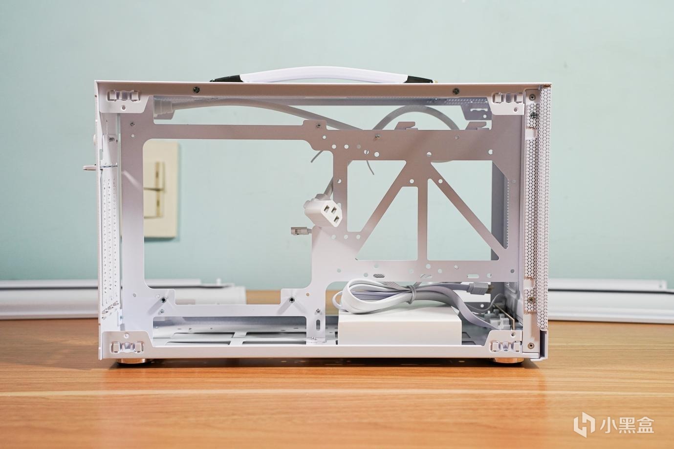 這裏是右側面看,中間的架子將機箱分爲了兩側。這一側右面是主板位置,左側是電源位置。機箱支持SFX電源。前面板引出線有3根分別是USB-A、USB-C和電源按鈕和電源狀態。一根電源引線從後部延頂部延伸到前面。