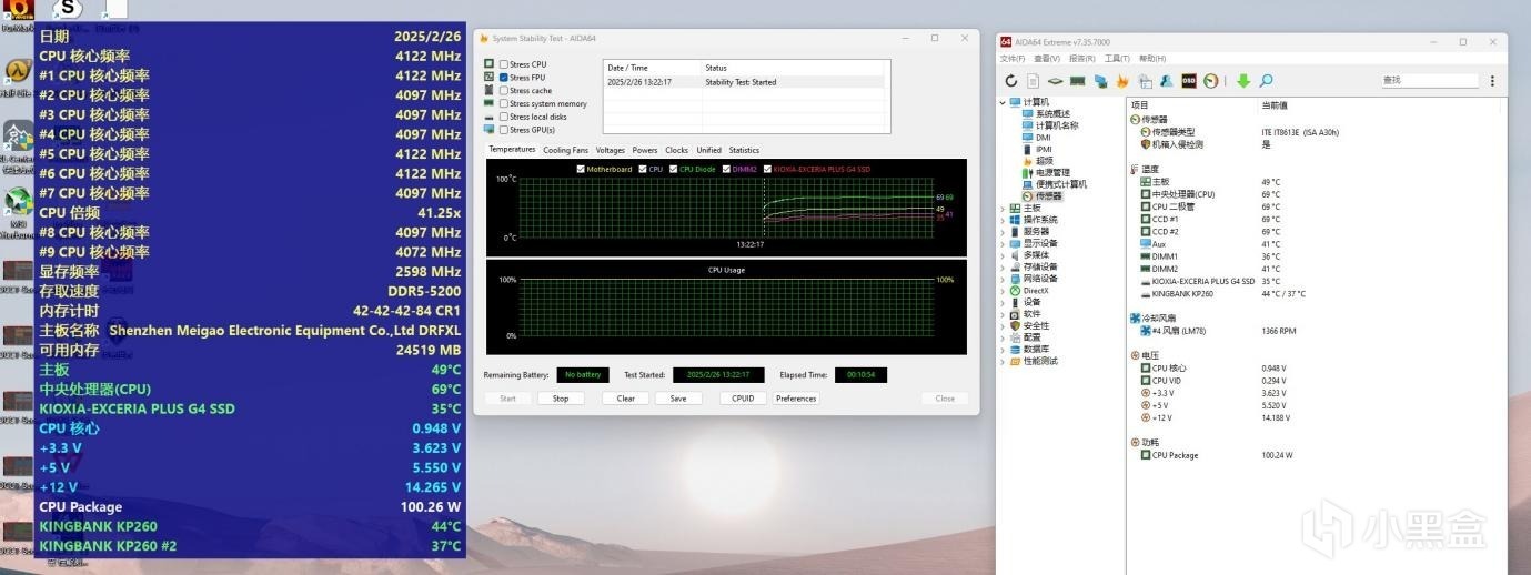 AIDA64 FPU壓力測試,CPU 功耗持續穩定在100W,而溫度則是穩定在69度,一個很清涼的溫度。