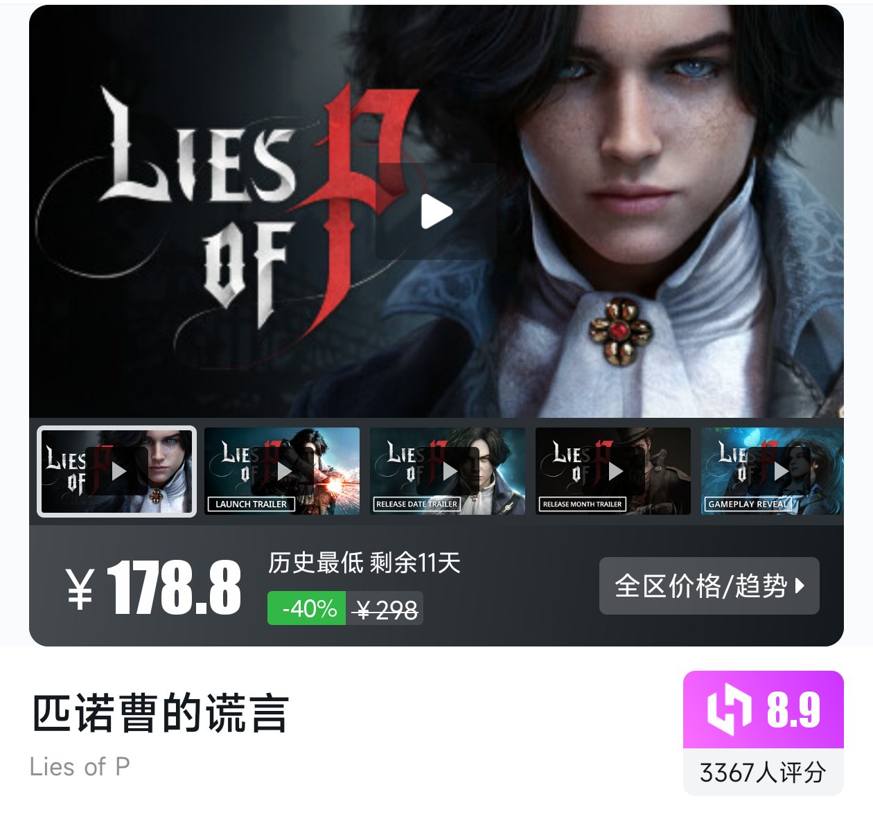 类魂动作游戏,以匹诺曹为蓝本创作,历史最低折扣剩余11天,小黑盒评分8.9