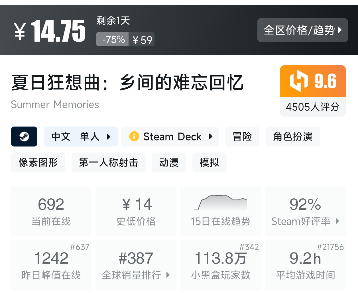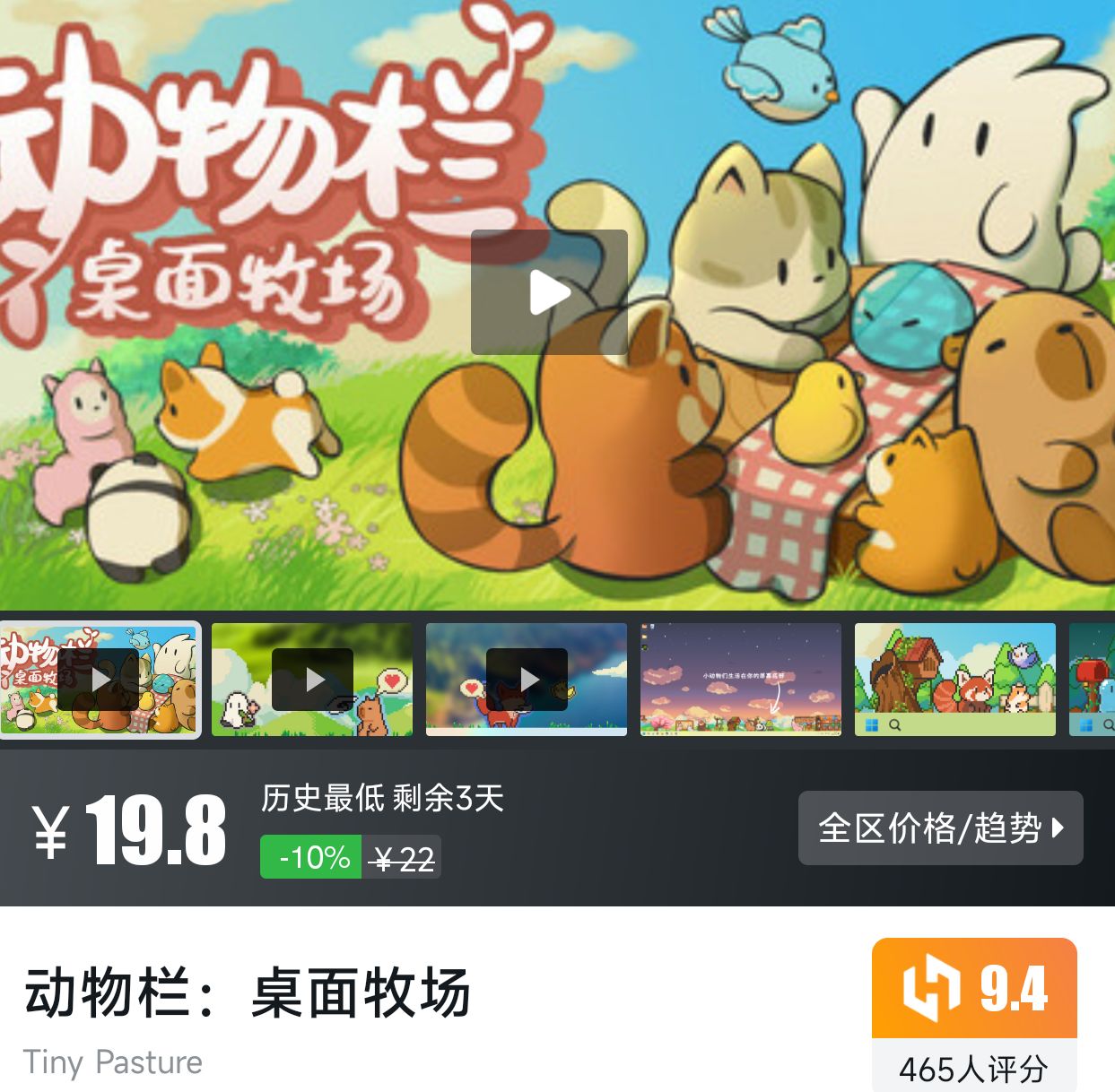 休闲养成游戏,历史最低折扣剩余3天,小黑盒评分9.4