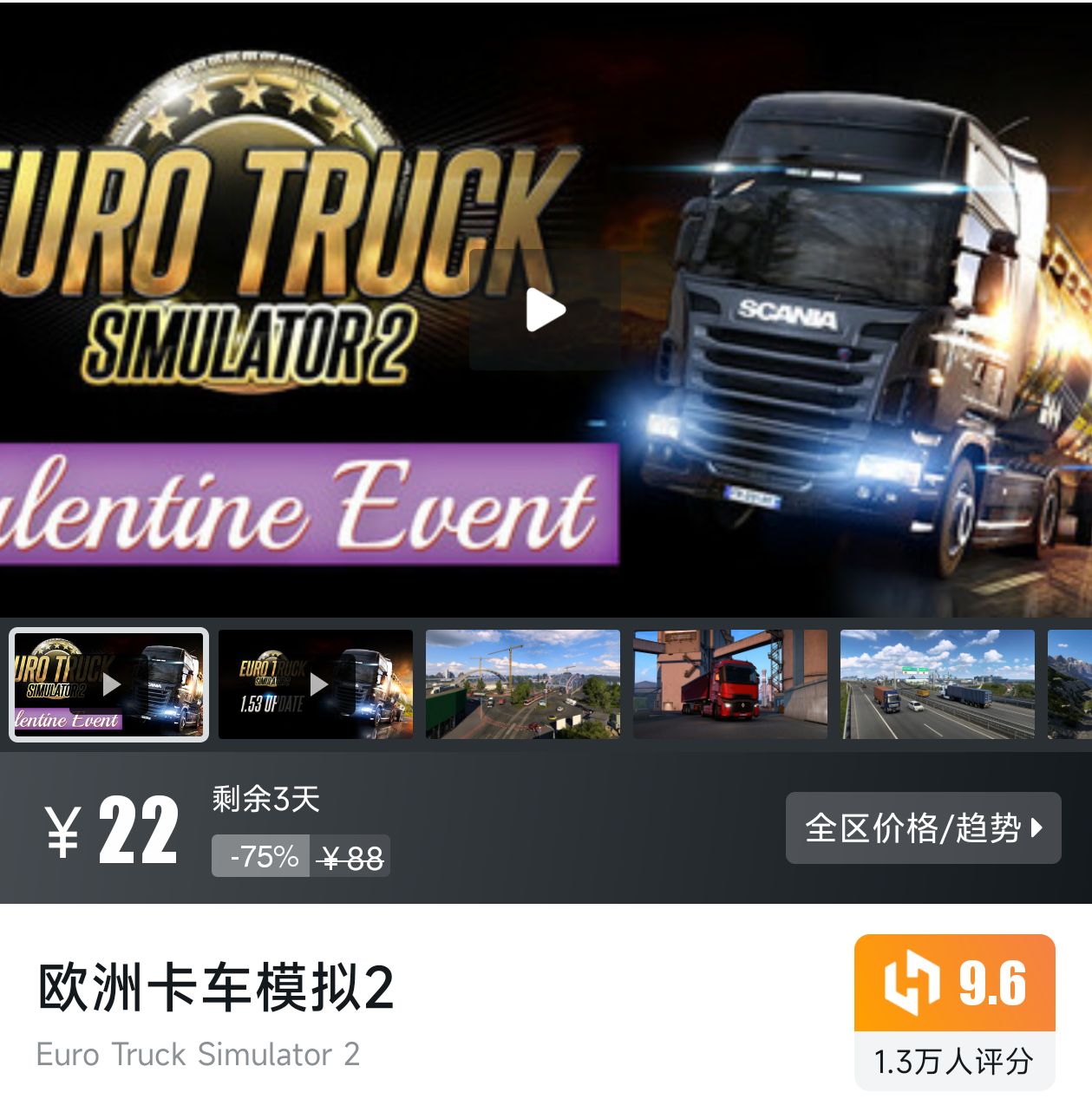 模拟驾驶游戏,玩家可模拟驾驶欧洲卡车运输,折扣剩余3天,小黑盒评分9.6