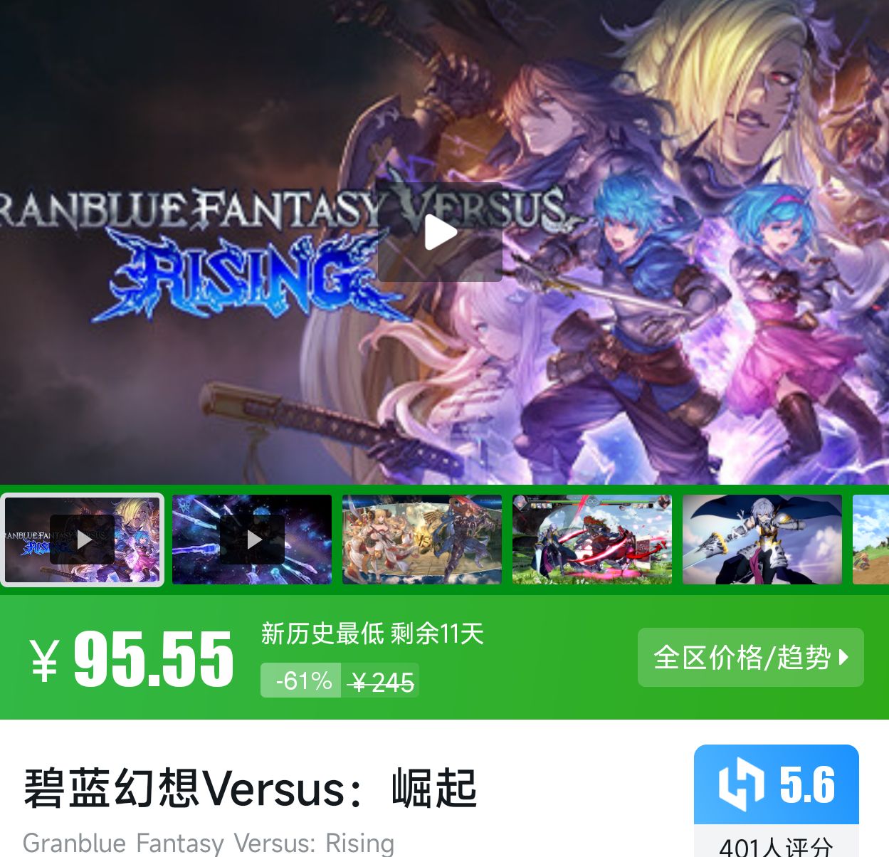 格斗类游戏,基于碧蓝幻想IP ,新历史最低折扣剩余11天,小黑盒评分5.6