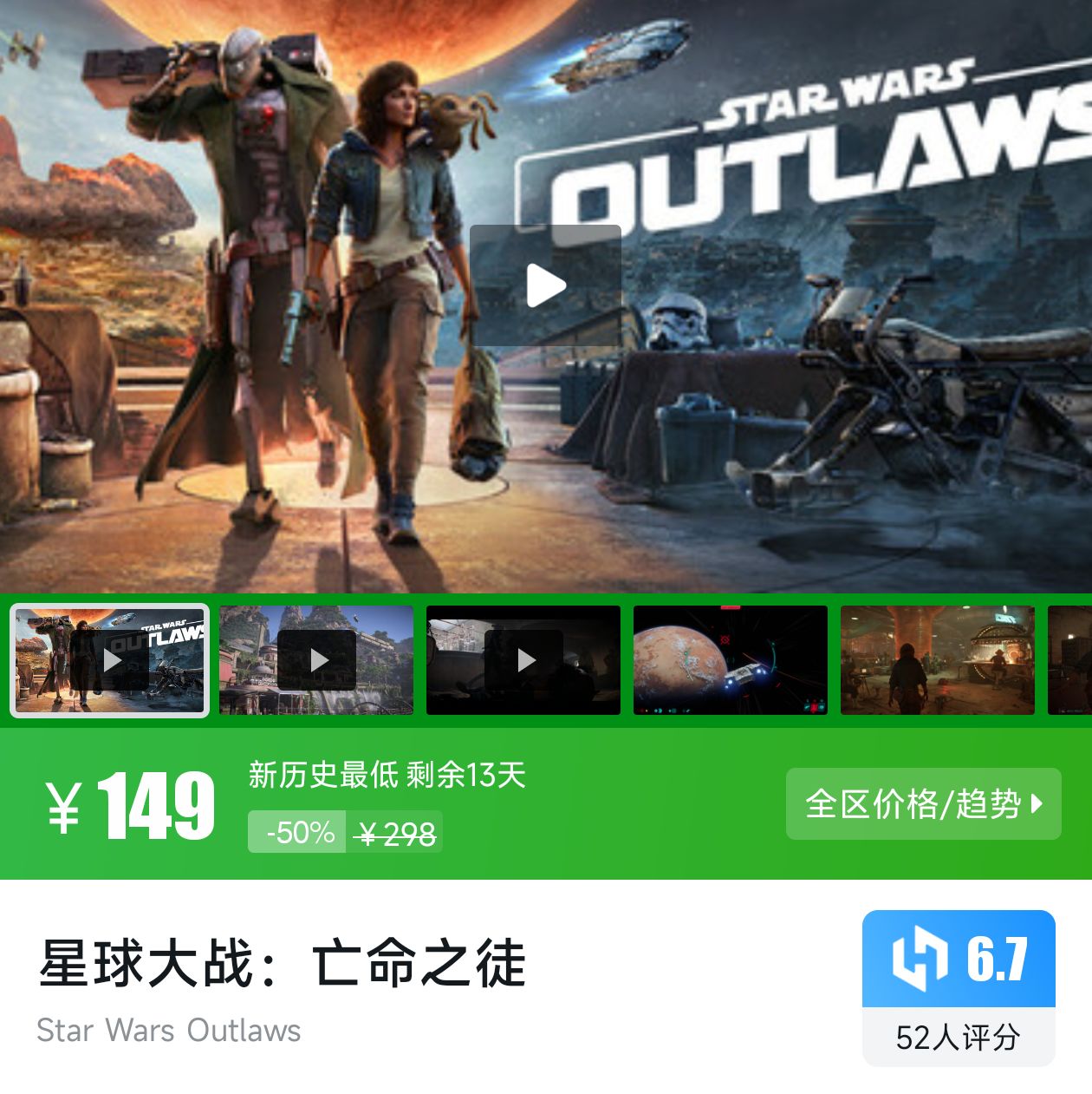 冒险游戏,基于星球大战IP ,新历史最低折扣剩余13天,小黑盒评分6.7