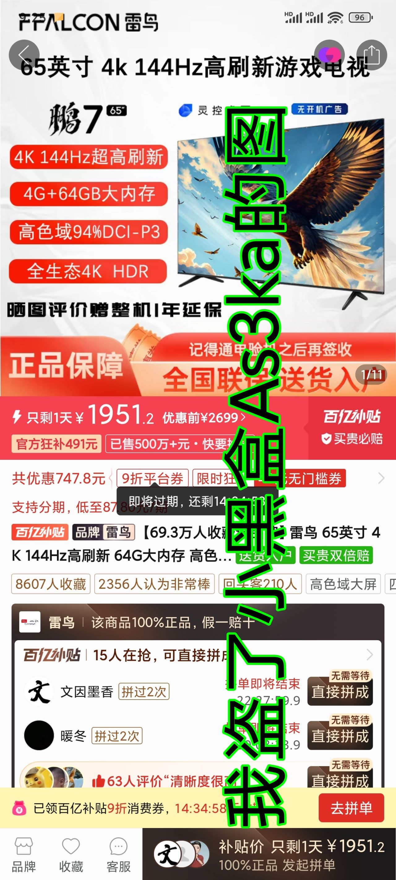 最後的話,推薦一款電視吧,我一月份買的,雷鳥鵬7,可以蹲一蹲,家裏客廳距離三米左右可以跟我一樣買65寸的,va屏144hz vrr,我是1830買的,最低好像能到1769,現在最低1951偏貴了,這個是包安裝的,可以免費裝牆,個人用着體驗確實不錯(沒有米恰),還有什麼鶴x雀x的應該是參數區別,注意看一下是什麼款。