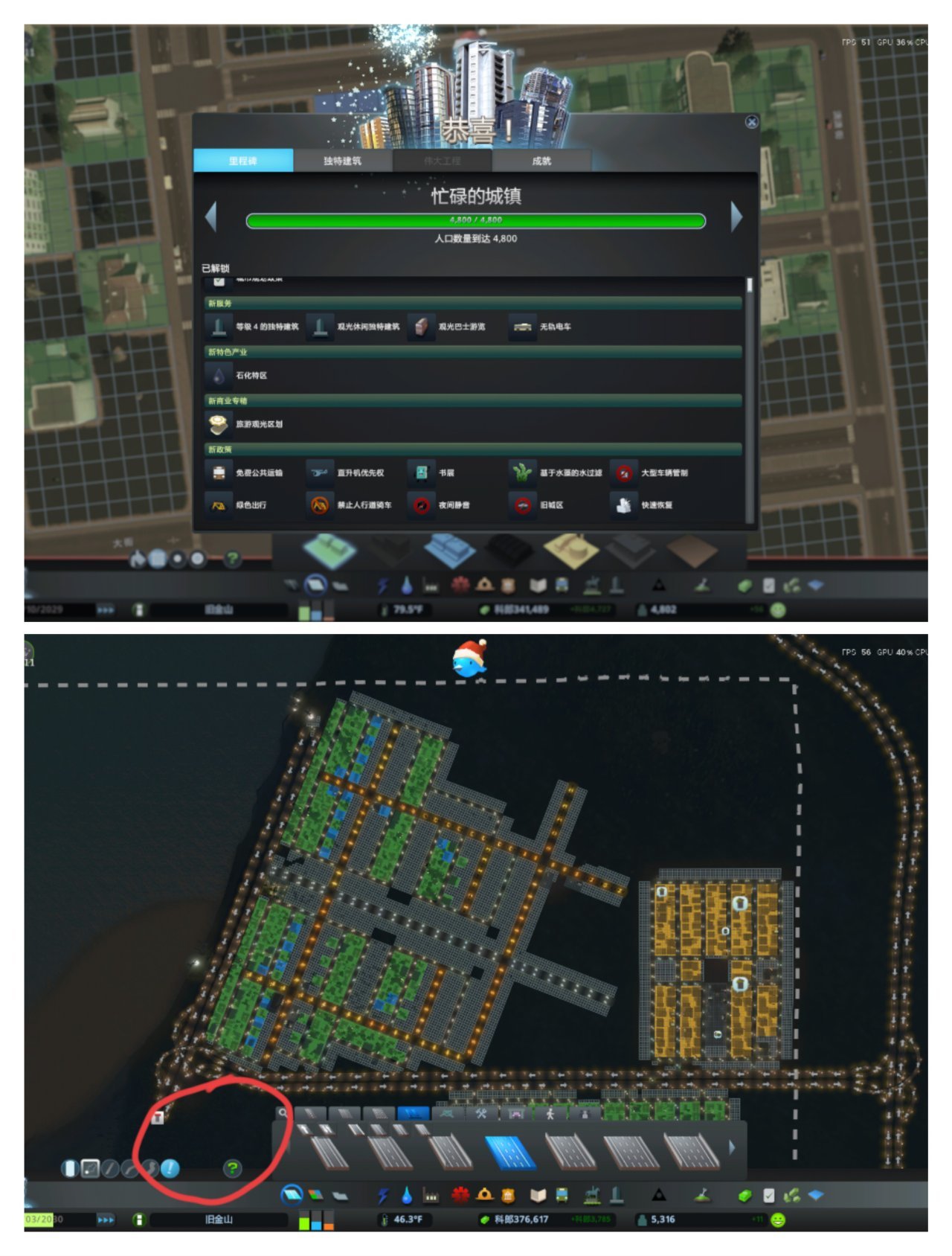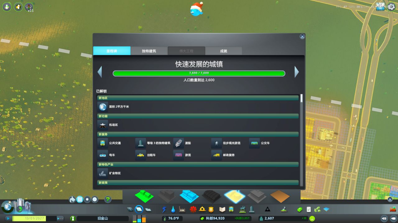冷知識:每次達到人口裏程碑後,可獲得現金獎勵,在2600人里程碑後,除去之前基礎設施的各項成本,此時應該有9萬科郎左右的結餘,可以用於開始建設我們的城區了