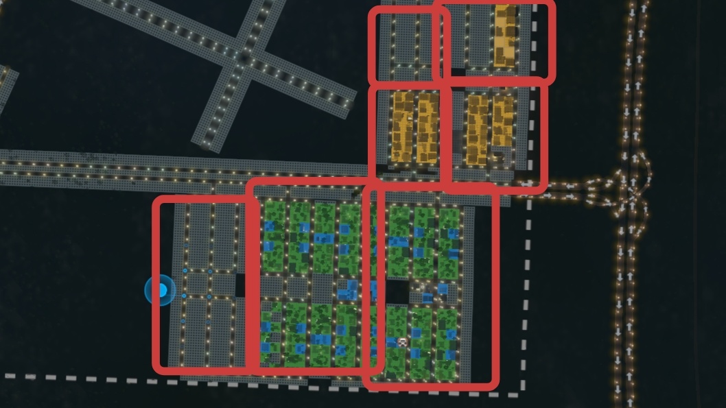 繼續延長高速至海岸,並在沿海高速劃出城區幹道,紅色爲6車道(大型道路)主幹道,黃色爲四車道(中型道路)輔幹道,綠色爲兩車道(小型道路)支道路,綠色連接黃色,綠色支路劃出居民商業區等等,基礎設施(警察,醫院)可放置在輔路(黃色旁邊)