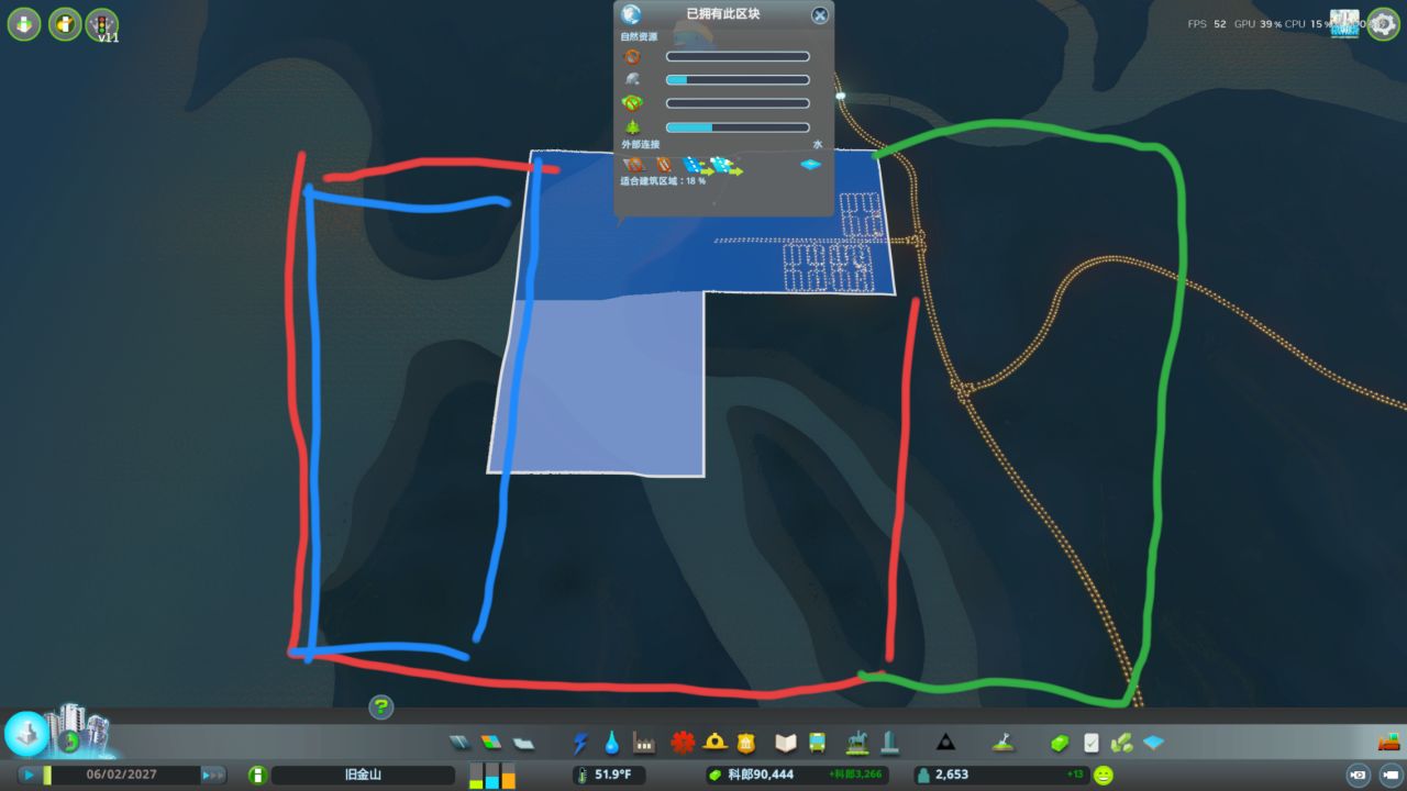 然後可以買兩塊地(無模組最多九塊),我的未來計劃是紅框內的區域,你也可以放棄藍框內的選擇綠框,綠框有鐵軌,可以用火車對外拉貨,藍框則是一個出海口,但沒有對外火車了。
