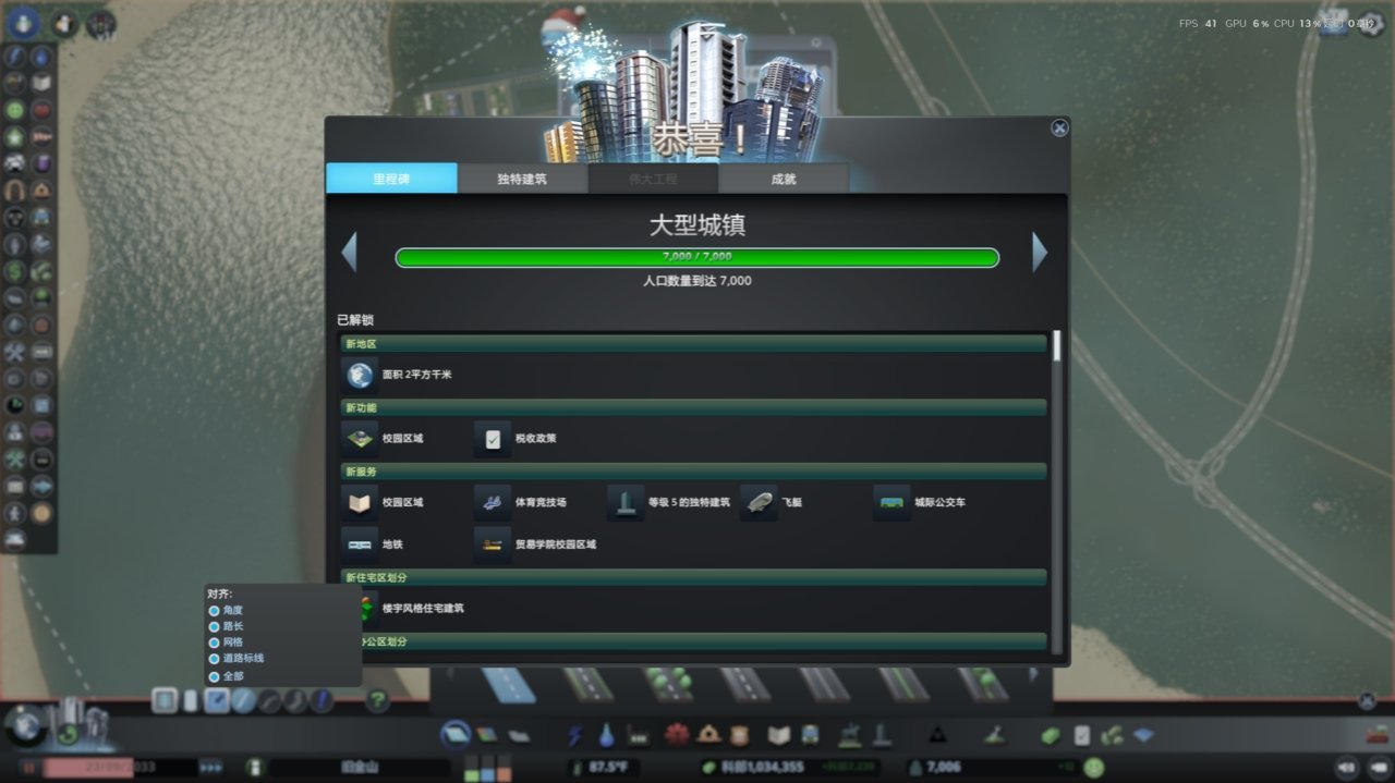 之後,差不多人口可以到達7000人口裏程碑,解鎖高密度區域與辦公區,此時,我們先將高密度與辦公區的稅率拉到13%後,建一所高中和大學,爲辦公區提供相應員工。