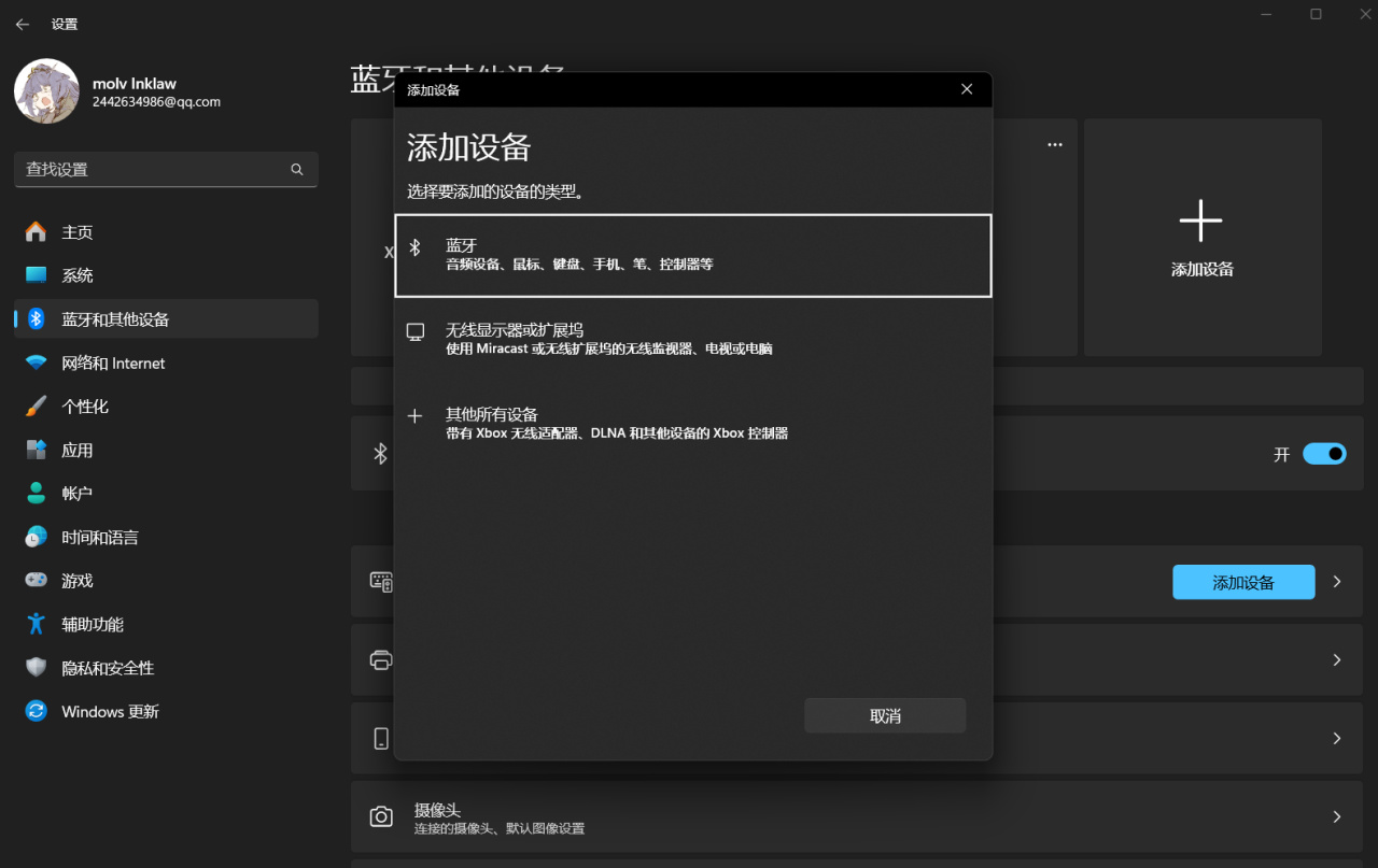 然后打开电脑的蓝牙菜单,添加设备,在这里你用手机搜索电脑的蓝牙并且配对