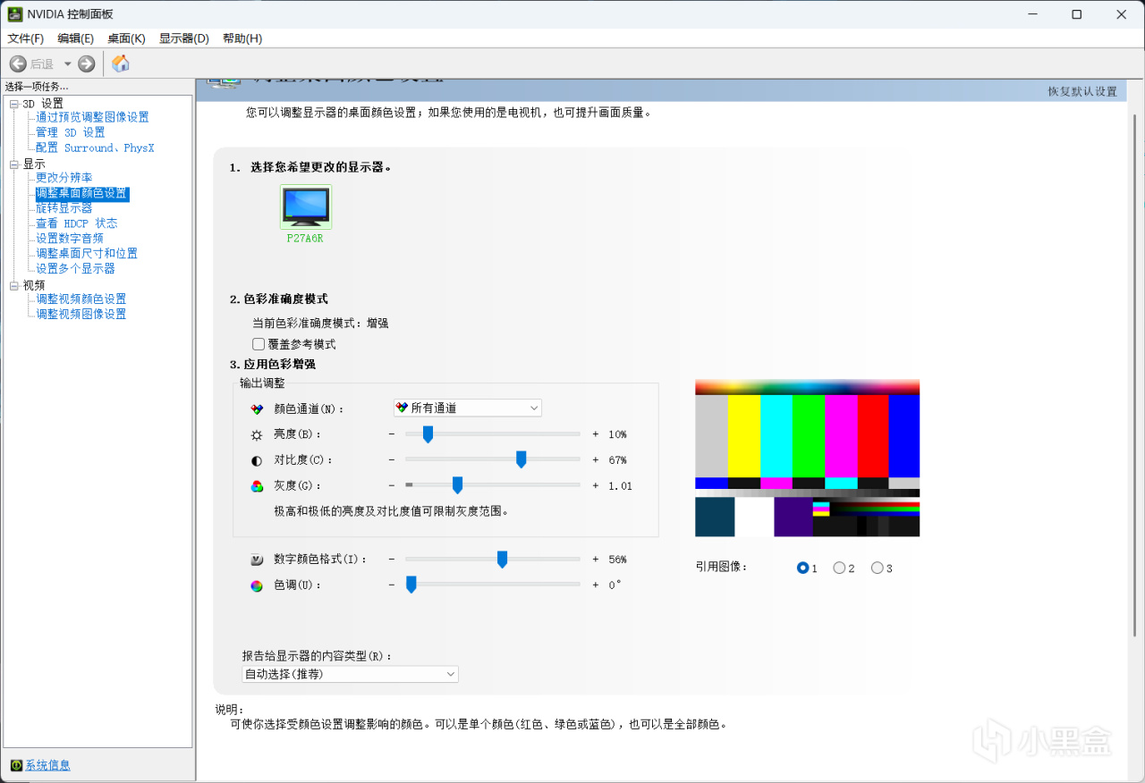 顯卡驅動中 顯示-調整桌面顏色設置- 應用色彩增強 設置自己喜歡的參數(注意顏色通道保持 所有通道,設置完成點擊應用)
