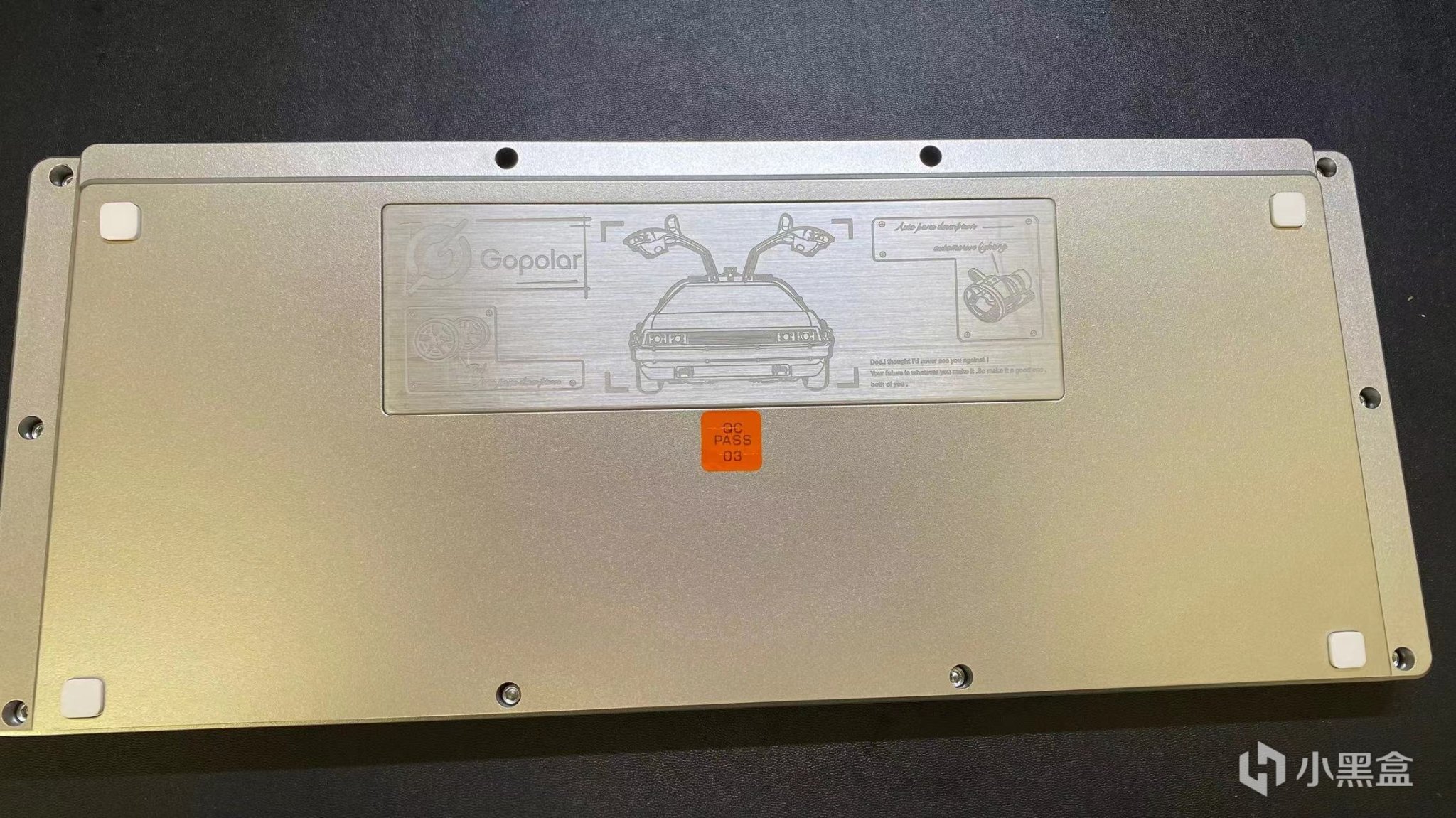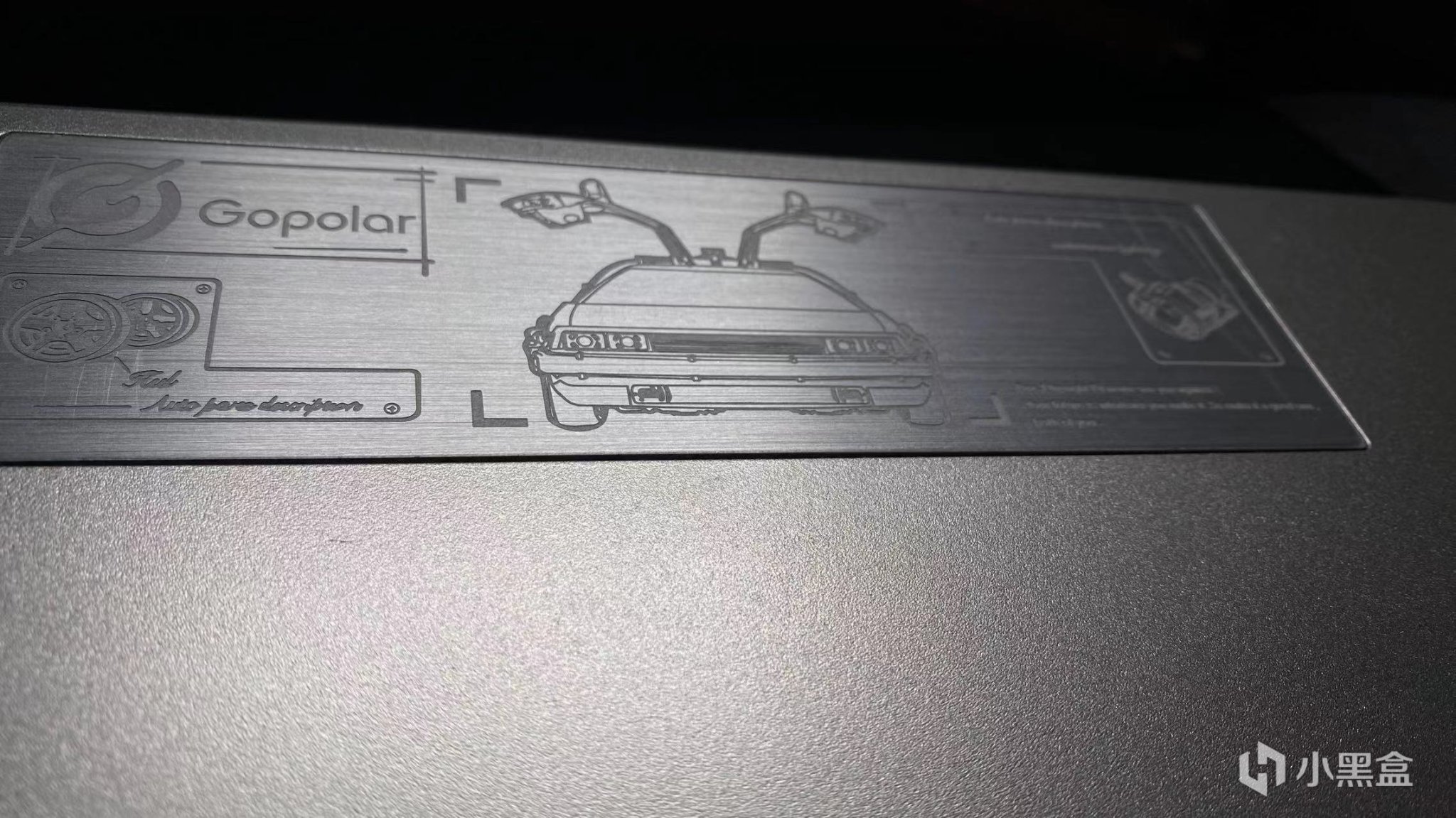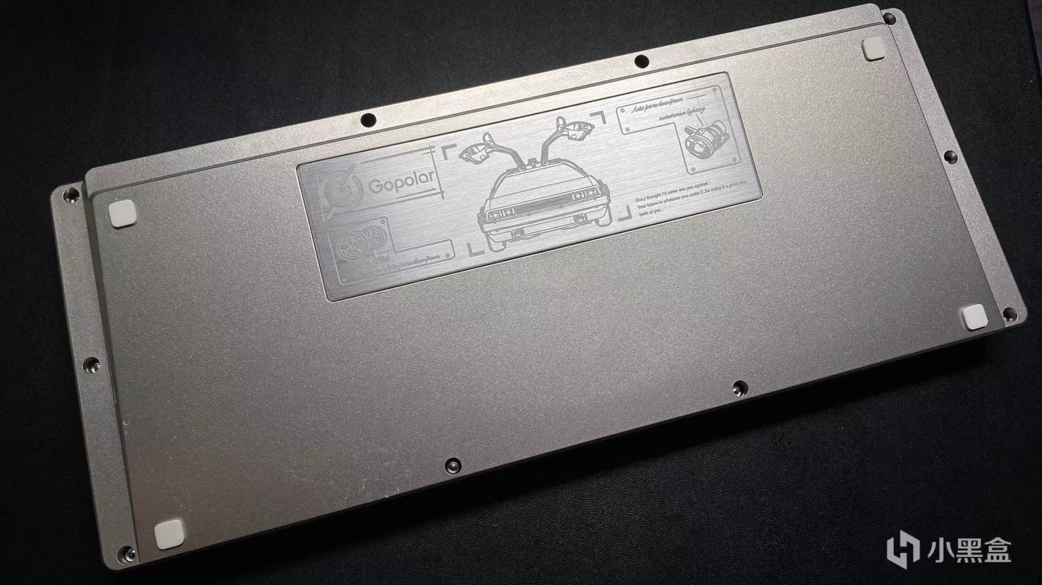 键盘背面的设计让我最喜欢的就是这个铭牌,这个铭牌的设计是参考的那个回到未来里面的那辆车而设计的,这个小设计我是真的很喜欢的。