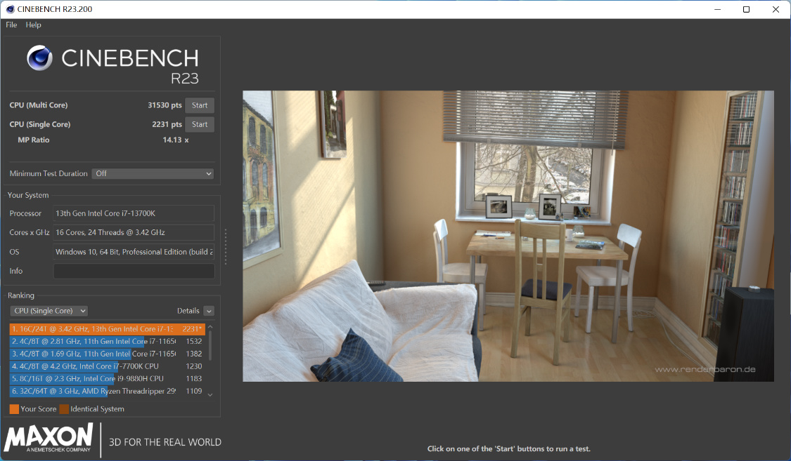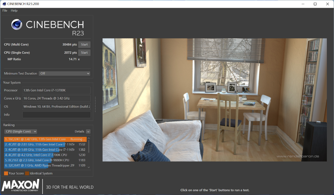 CineBench R23基准测试,自动睿频时,单核得分2072pts,多核得分30484pts;