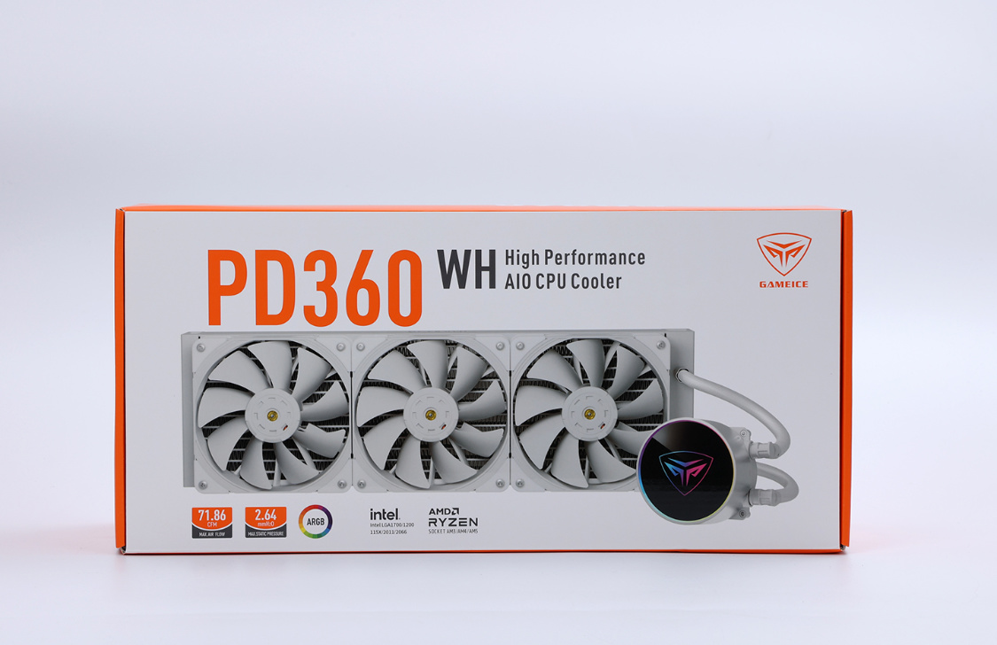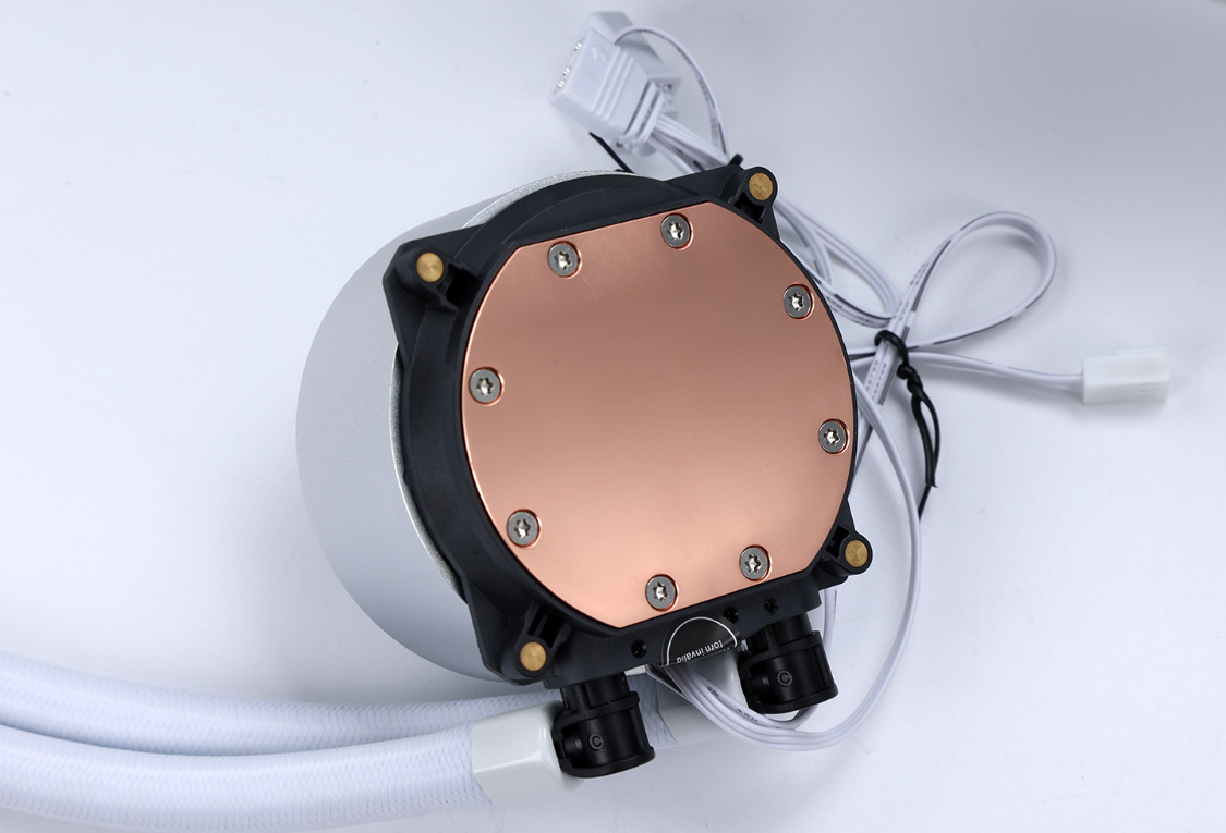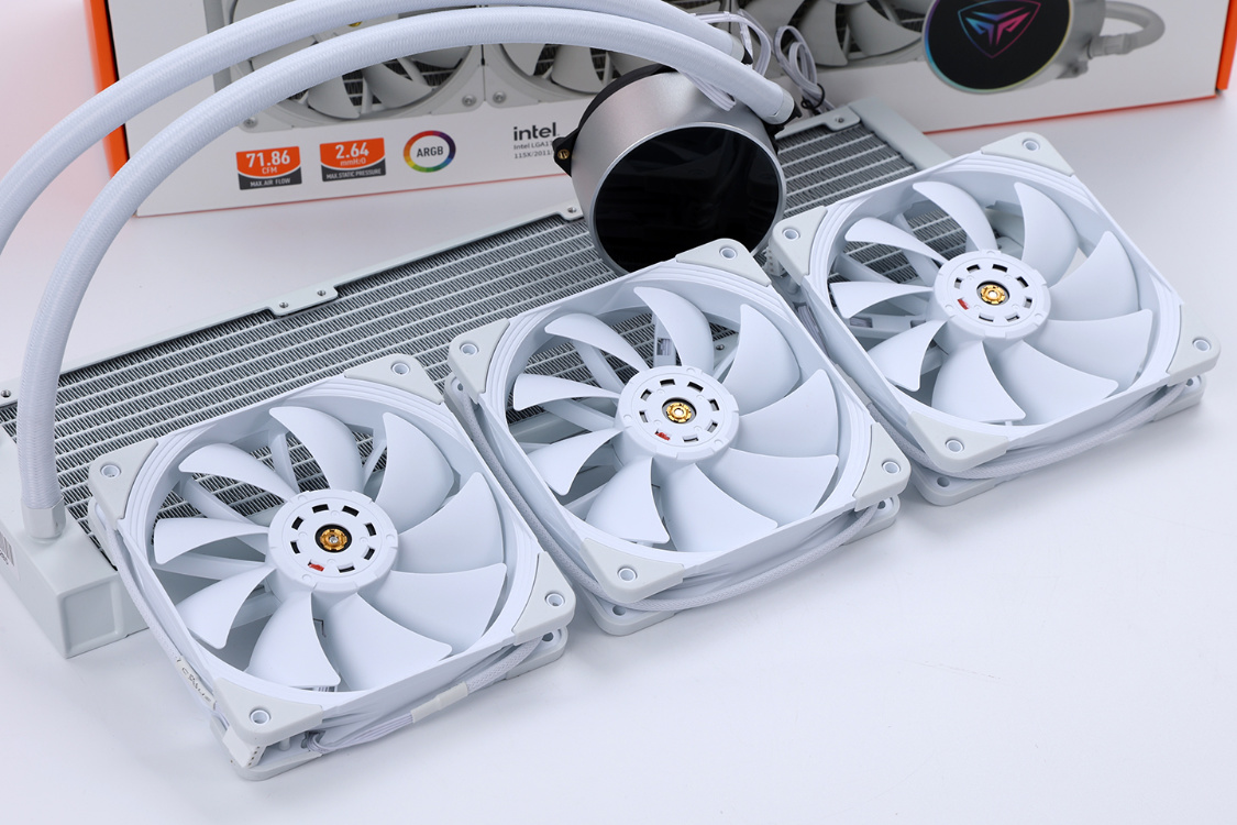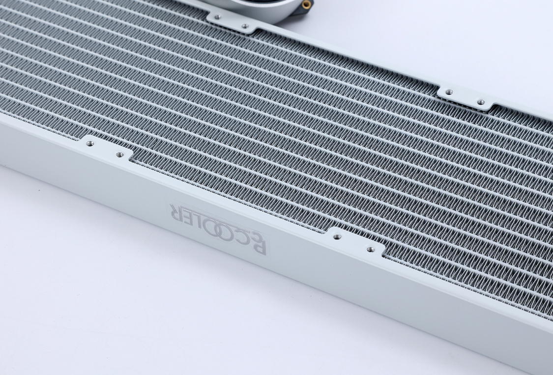 纯白配色冷排,颜值优秀。冷排上的12条高强度微水道和高密度S形散热鳍片,搭配上396*120*27mm的加厚冷排,有效的降低了冷排内部的水阻,使冷排可以承受更高的散热效率和更快的水循环速率;