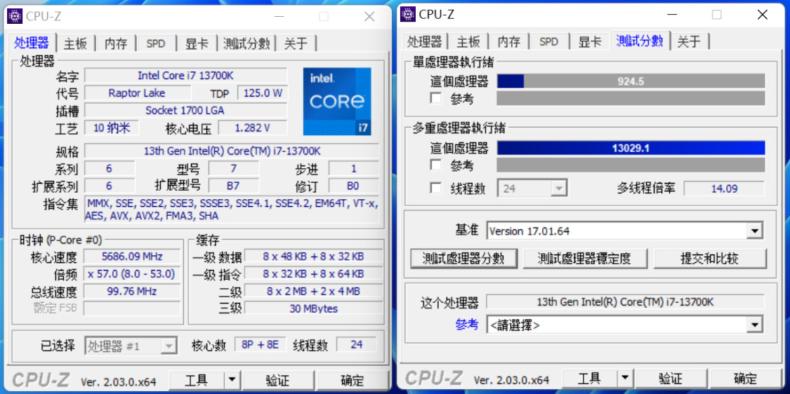 手动OC至5.7GHz,单核得分924.5分,多核得分13029.1分;