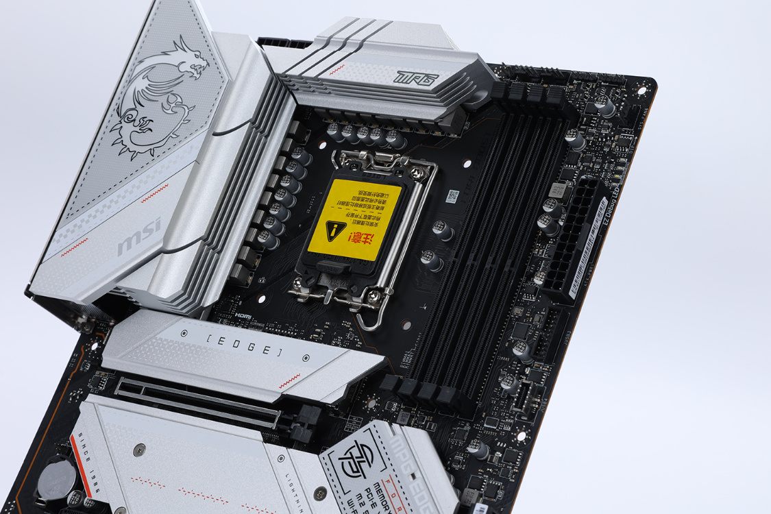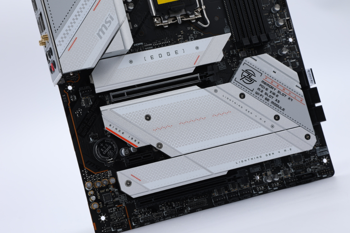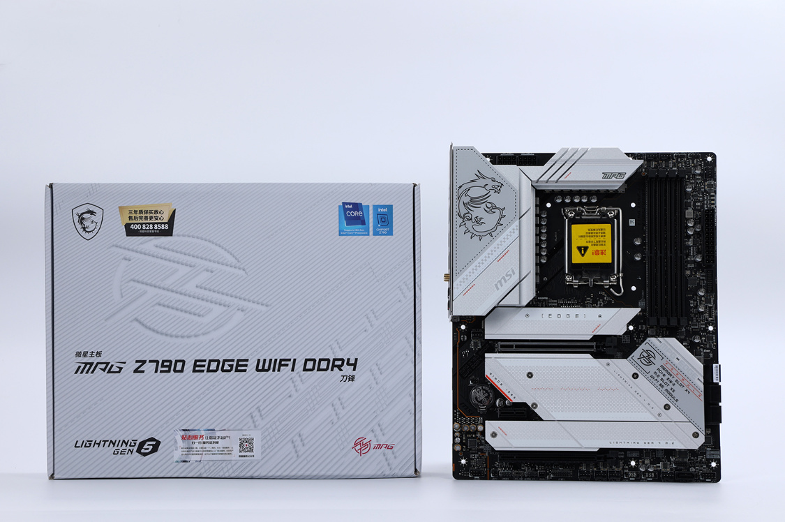 想要发挥13700K处理器的全部性能,一块可超频的Z790主板当然不能少。今天装机选择的是微星MPG Z790 EDGE WIFI D4主板,ATX规格,拓展性和兼容性都足够优秀。主板表面覆盖了大面积银白色金属散热甲,扎实的堆料和精致的外观,搭配一些赤色的线条点缀,颜值方面直接拉满。