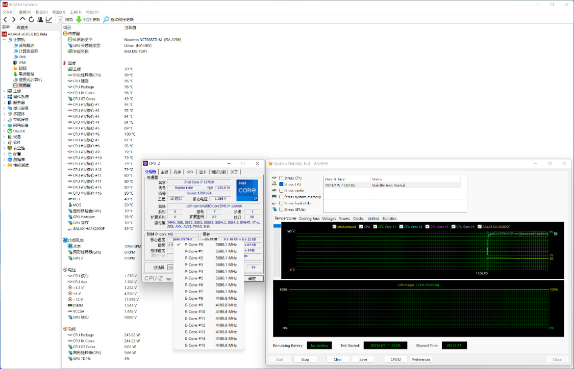 手动OC至5.7GHz后,烤机10Min,CPU温度拉高至99°,CPU功耗250W左右;