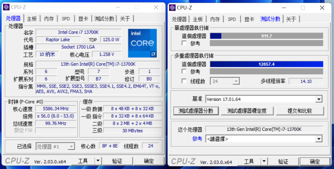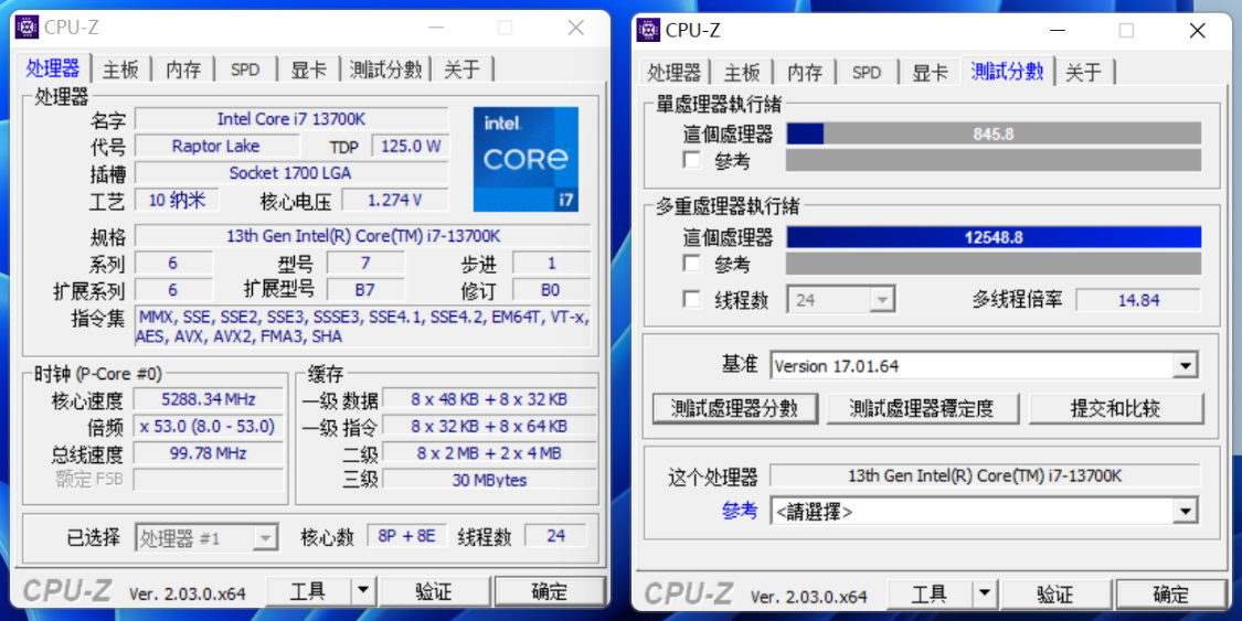 CPU-Z基准测试,自动睿频时,单核得分845.8分,多核得分12548.8分;