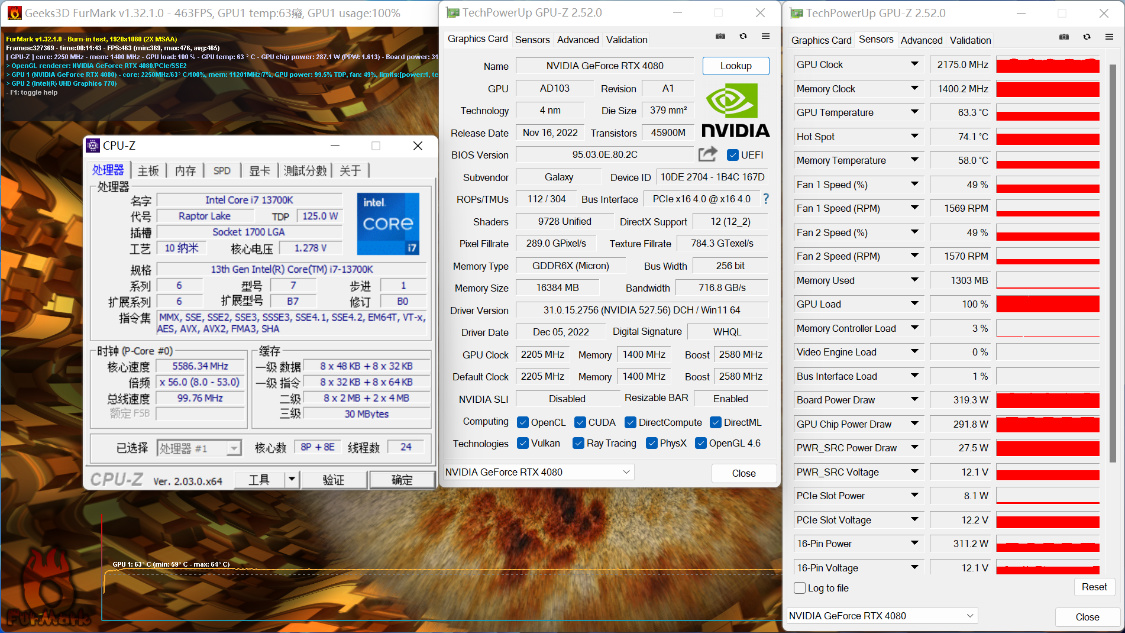 FurMark显卡烤机测试,烤机10Min,显卡温度为63°左右,显卡功耗为320W左右;