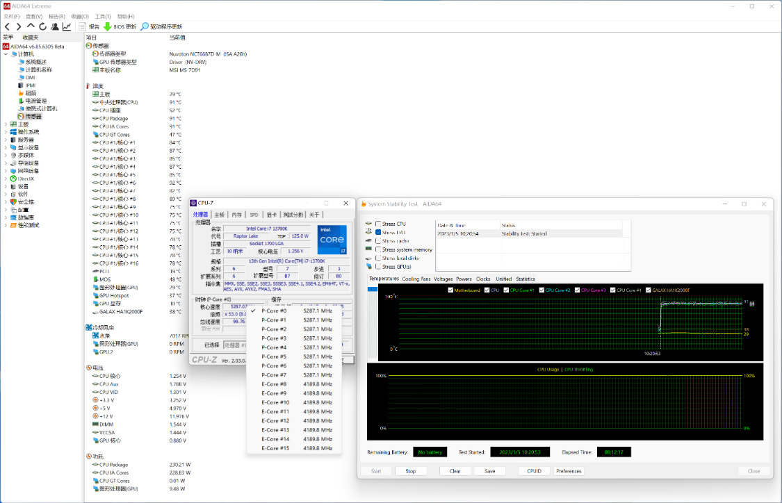 室温26°,机箱内环境,CPU自动睿频时,单烤FPU测试,烤机10Min,CPU温度为91°左右,CPU功耗为230W左右;